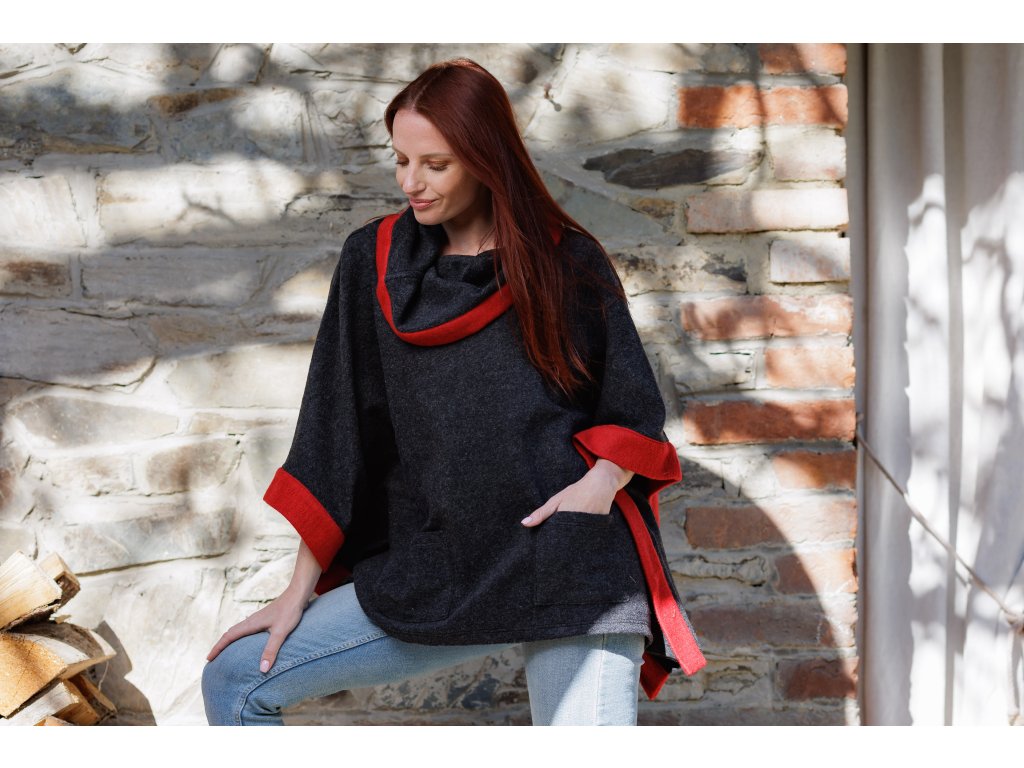 A Greta poncsók 100% juhgyapjúból készült, fekete színben. A Greta poncsók széles garbónyaka biztosítja a könnyű öltözködést, ha a fejedre húzod. A nyakkivágás és az ujjak jellegzetes piros színű kontúr szegéllyel vannak ellátva. A szegély szélessége kb. 4 cm. A poncsók alján a jobb és bal oldalon praktikus zsebek találhatók.