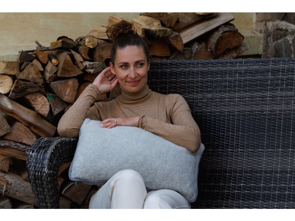 A párna készítéséhez kétféle gyapjúból készült. A legfinomabb gyapjúból, ausztrál merinóból készült, amelyet alpaka gyapjúszálakkal dúsítottak. A huzat arányosan 95% ausztrál merinó gyapjút + 5% alpaka gyapjút tartalmaz. A szürke színe csak akkor tűnik ki legszebben, ha saját szemével látja. Tapintásra nagyon puha anyag, nincs nyoma érdességnek vagy irritálásra való hajlamnak.