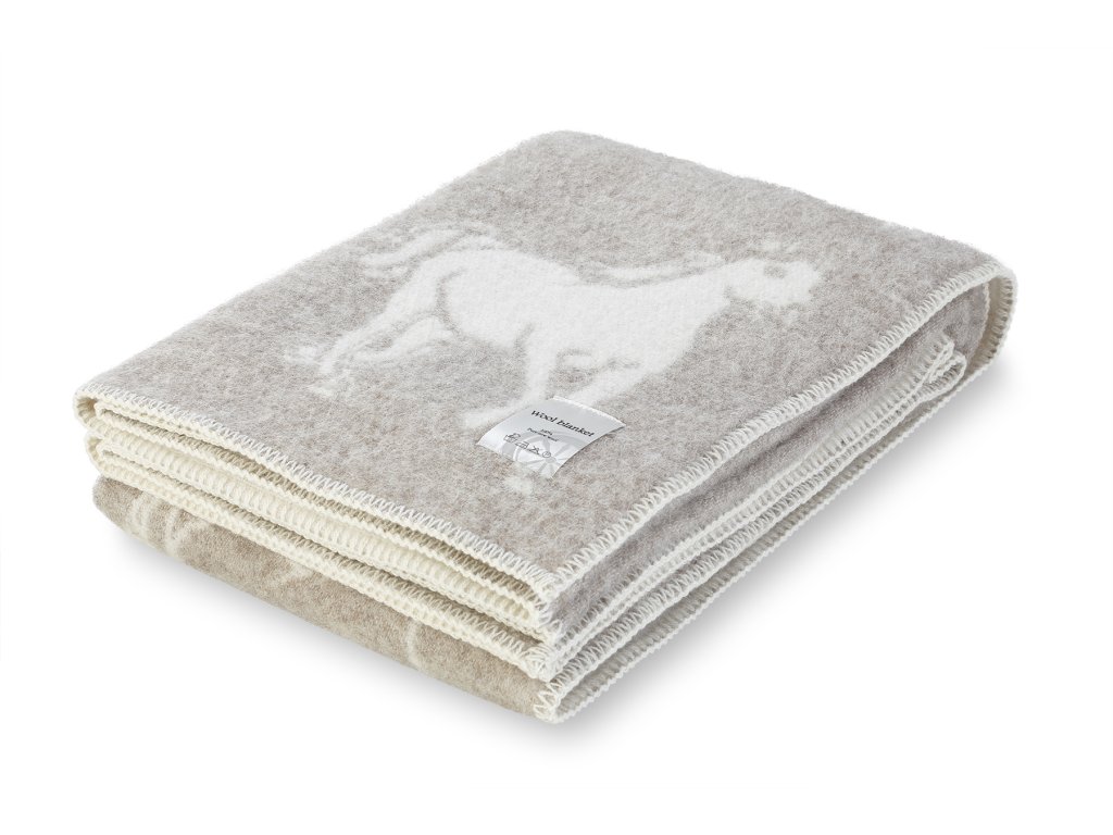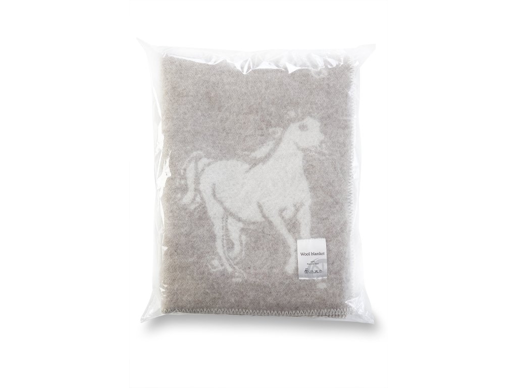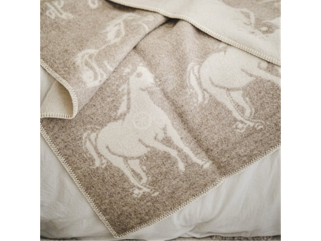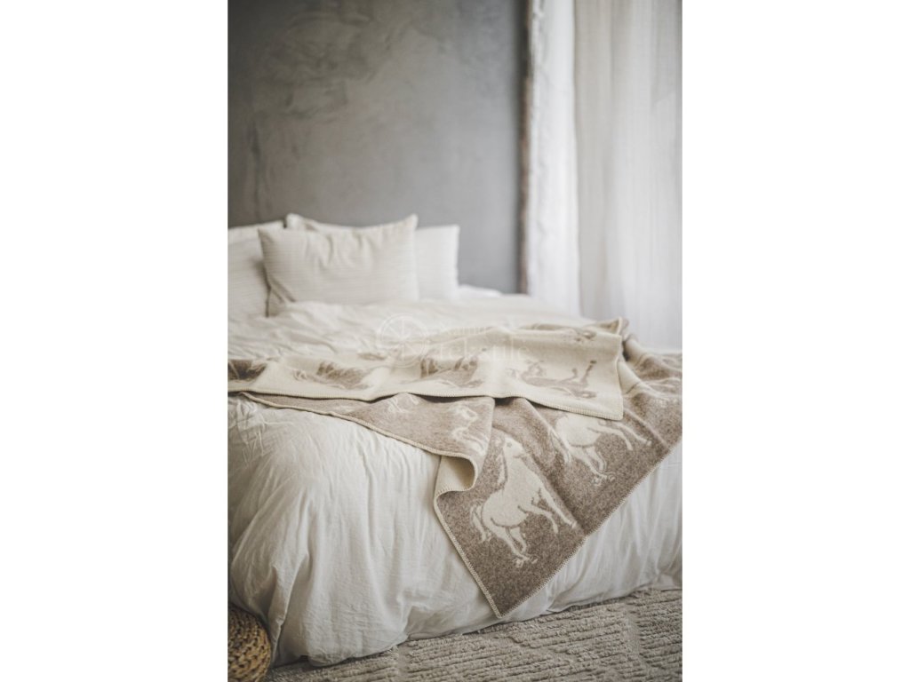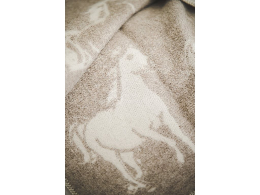 Anyag: 88% új-zélandi juhgyapjú, 12% pamut; Méret: 130 x 200 cm, Szín: barna és fehér, ábrázolt motívum: lovak, Súly: 1,2 kg, Súly: 480g/m2
