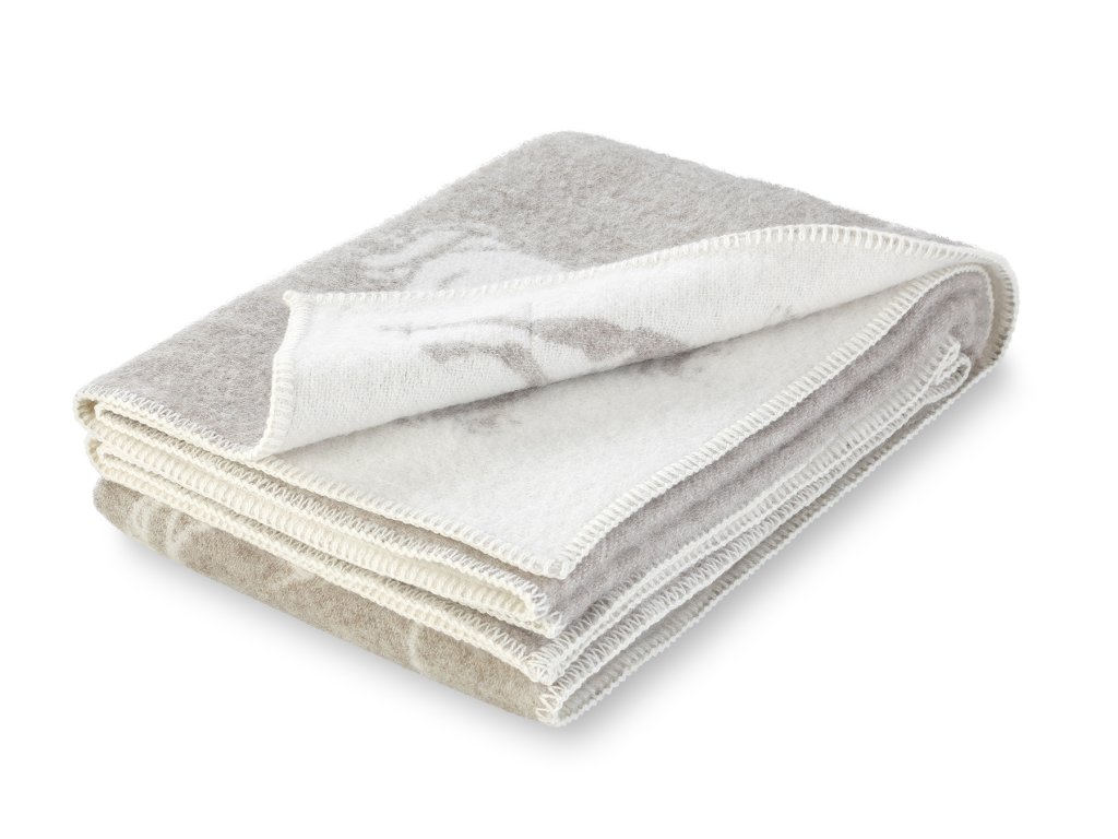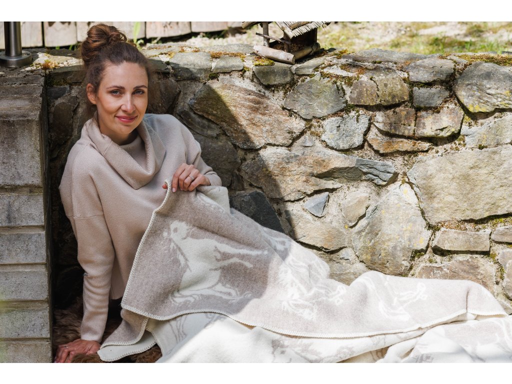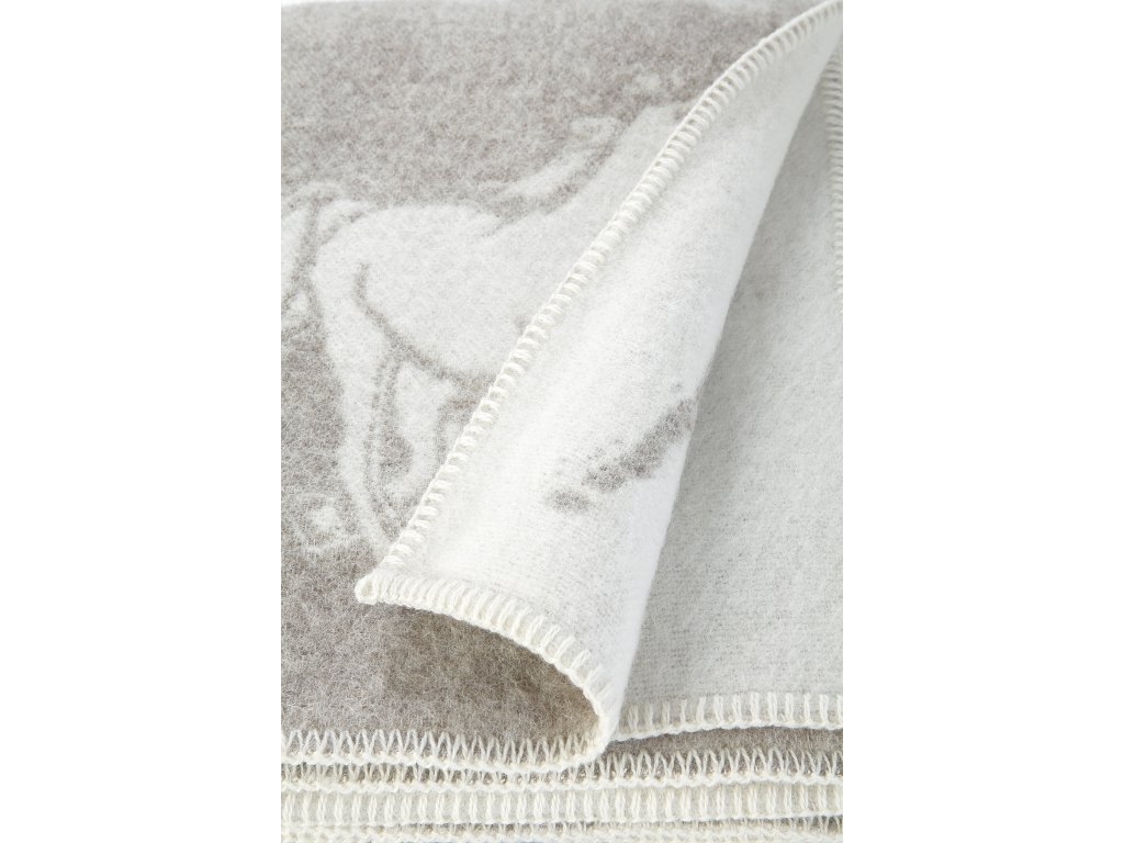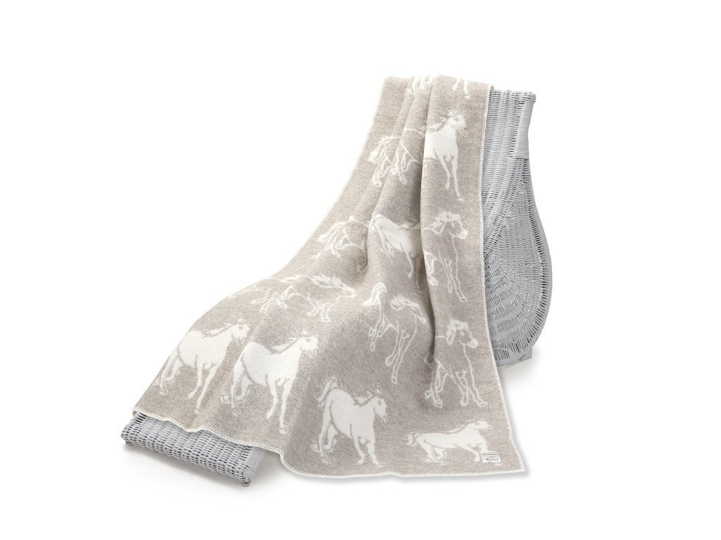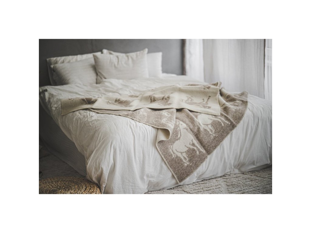 Anyag: 88% új-zélandi juhgyapjú, 12% pamut; Méret: 130 x 200 cm, Szín: barna és fehér, ábrázolt motívum: lovak, Súly: 1,2 kg, Súly: 480g/m2