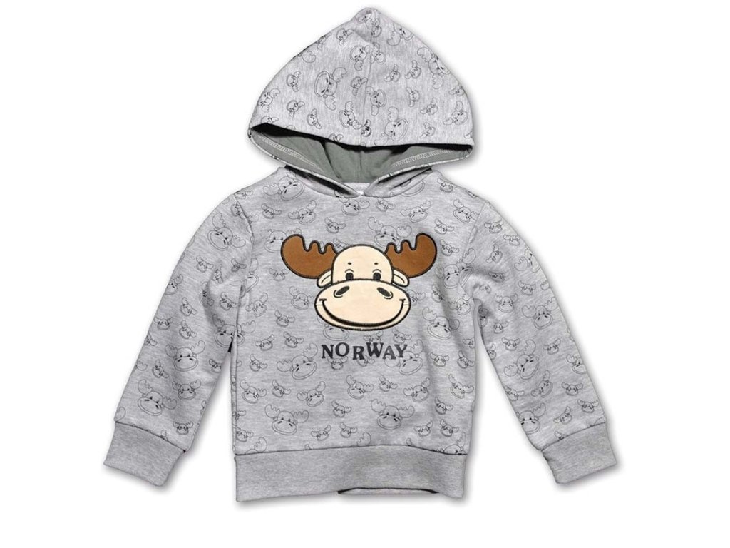 Vidám gyermek kapucnis pulóver világosszürke színben, kapucnival. A kapucnis pulóver jávorszarvas motívummal van nyomtatva. A mellkasra egy nevető jávorszarvas karikatúrája van varrva, nyitott szájjal és rózsaszín nyelvvel. A karikatúra alatt feketével a NORVÉGIA felirat olvasható. A gyermekpulóvert a fejre húzva kell felvenni, nincs rajta rögzítőelem.