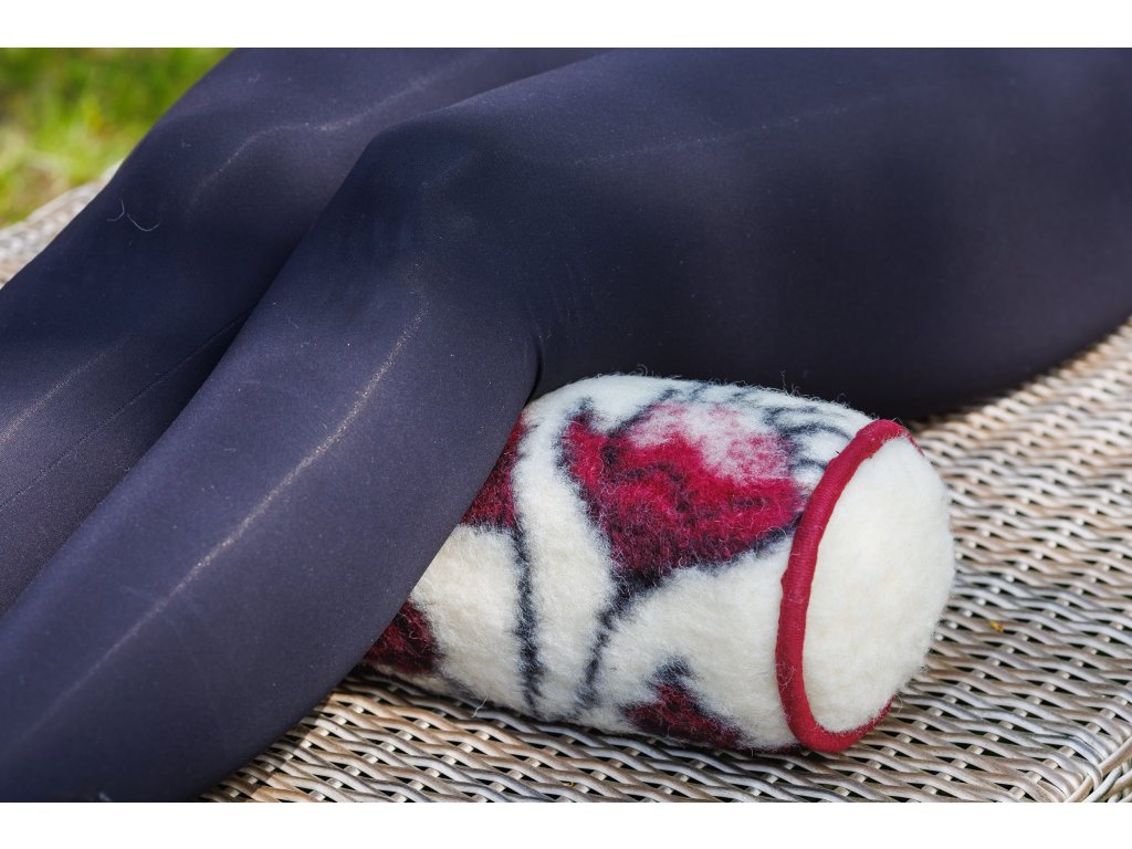 Anyag: 100% európai merinó, Méret: szélesség 40 cm x átmérő 15 cm, Motívum: vörös rózsa, Töltelék típusa: 50% szilikon golyók + 50% memóriahab darabok, Gyapjú súlya: 400g/m2