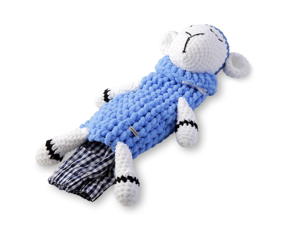 Puha és praktikus pizsamatáska fiúknak a pizsama tárolására. Ez a kék bárány kedves segítőtársa minden gyermeknek, aki szeretné megtanulni, hogy a pizsamáját a helyére tegye. Anyag: 100% zseníliafonal (100% poliészter), Hossz: kb. 64 cm a fejjel együtt x kb. 18 cm szélesség, Szín: kék - a színárnyalat eltérhet a képtől, Rögzítés: húzózsinór alul