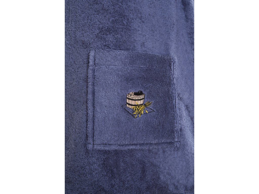 Anyag: 100% pamut, Szín: sötétkék, Méret: 55 x 150 cm, Alkalmas: férfiaknak, Felhasználás: szauna kiegészítők, Rögzítés: tépőzáras