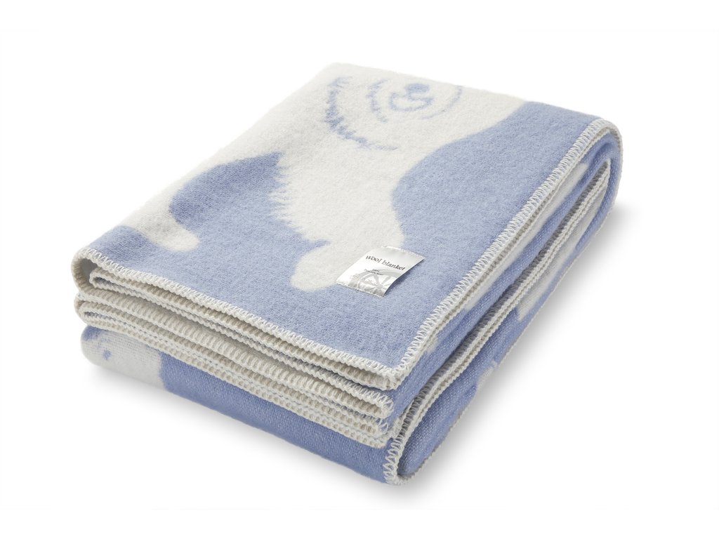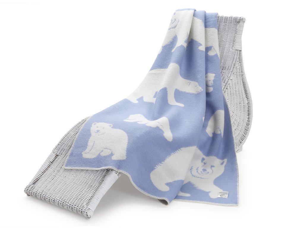 Anyag: 88% új-zélandi juhgyapjú + 12% pamut, Méret: 130 x 200 cm, Szín: kék és fehér, Ábrázolt motívum: jegesmedve, Súly: 1,2 kg, Súly: 480g/m2