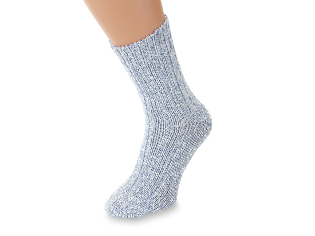 A kék színű merinó zokni puha, finom és meleg. A zokninak laza szegélye van, amely nem szorítja a lábat a vádli területén. A zokni puha lépést és stabilan meleg érzetet biztosít a lábaknak. A merinó gyapjú biztosítja, hogy a lábak nem izzadnak. A gyapjú felszívja a nedvességet, majd elvezeti.