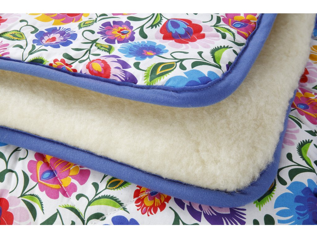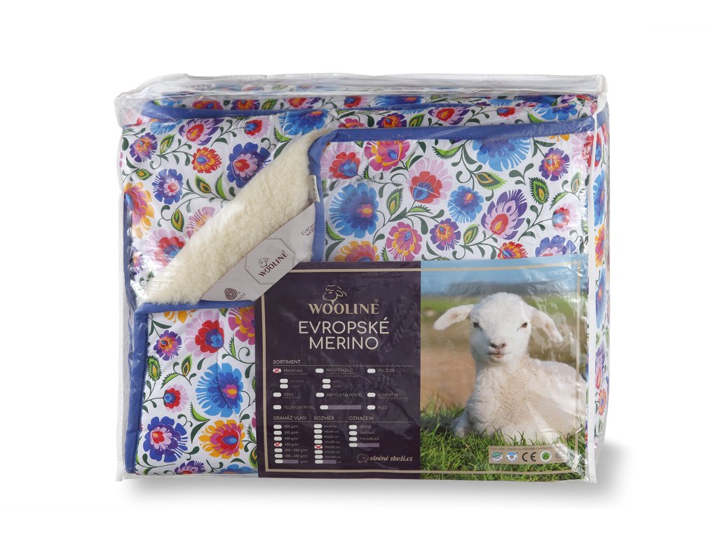 Anyag: 100% európai merinó gyapjú / 100% pamut, nyomtatással, Design: kétoldalas- a hátoldalon színes szláv virág- és levélmotívummal, a hátoldalon egyszínű, világos krémszínű, Méret: 140 x 200 cm, Súly: 2,5kg, Súly: 450g/m2