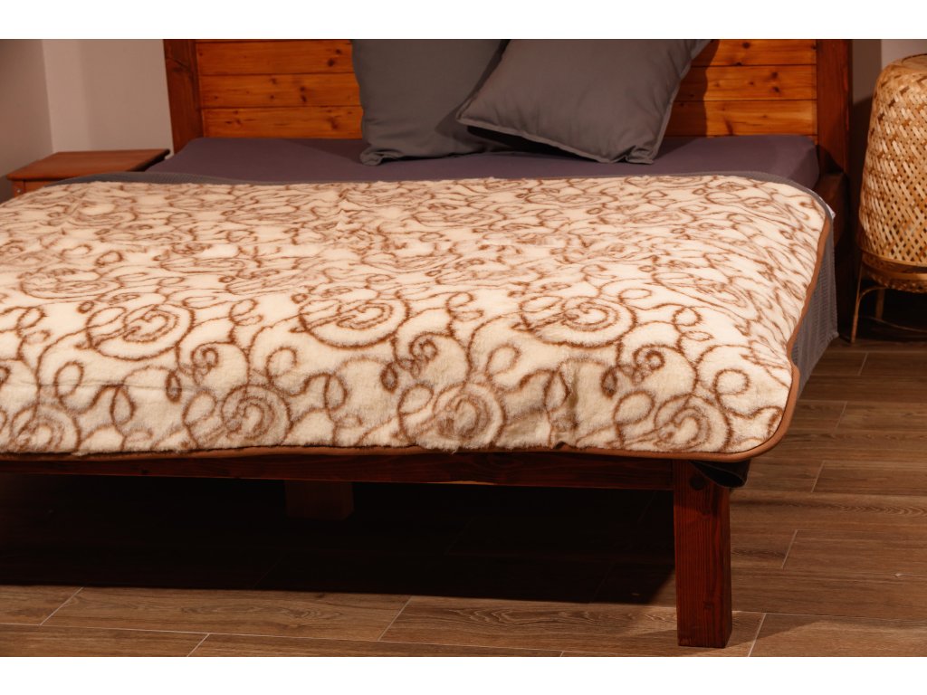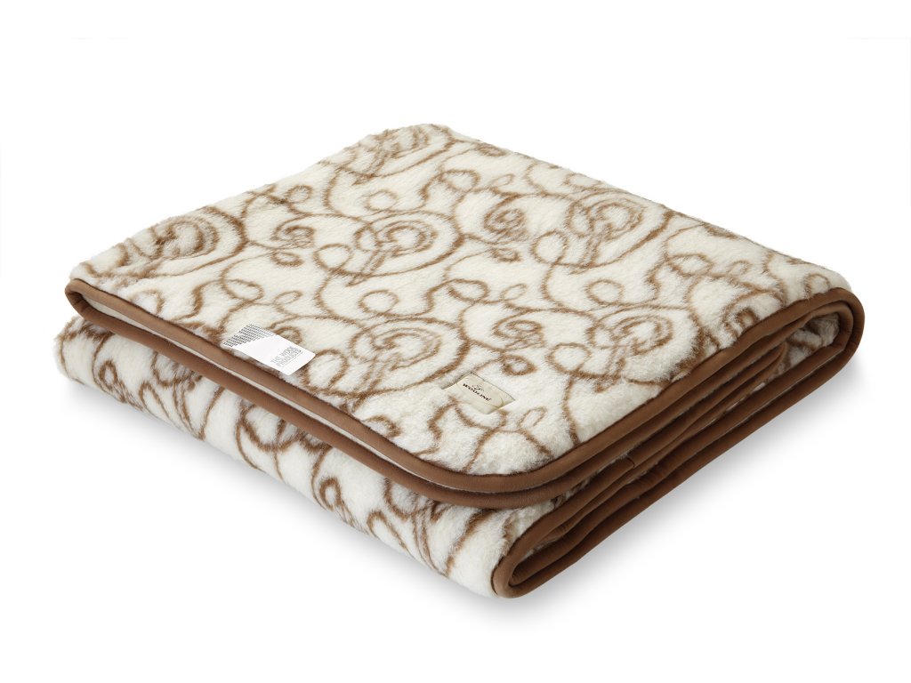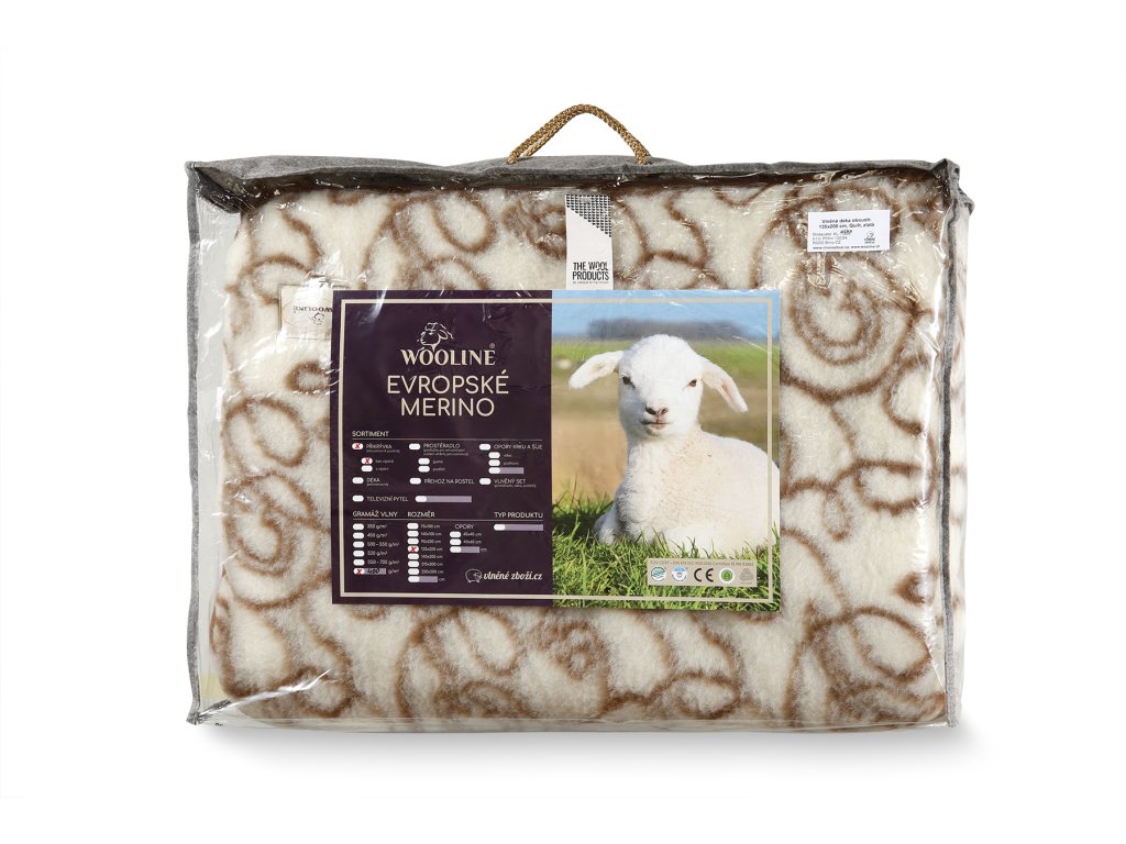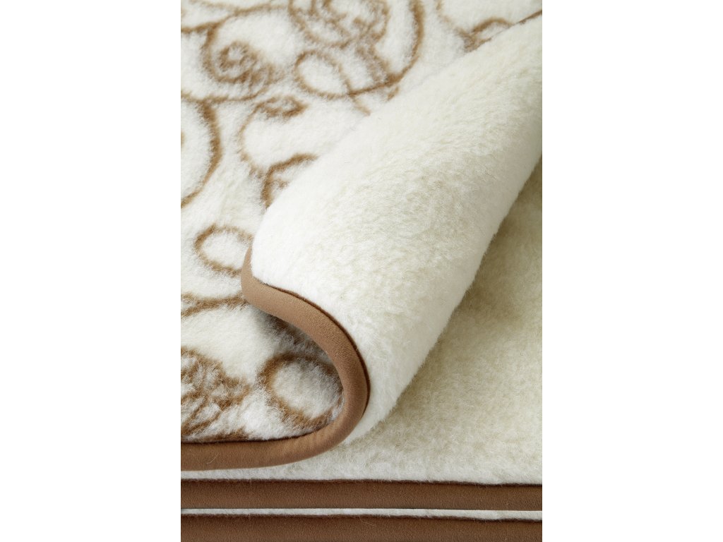 Anyag: 100% európai merinó (100% birkagyapjú), Kialakítás: kétoldalas - a fonákán motívummal, a színén világos krémszínű, Méret: 135 x 200 cm, Súly: 2,4 kg, Szálsűrűség: 2 x 400 g/m2