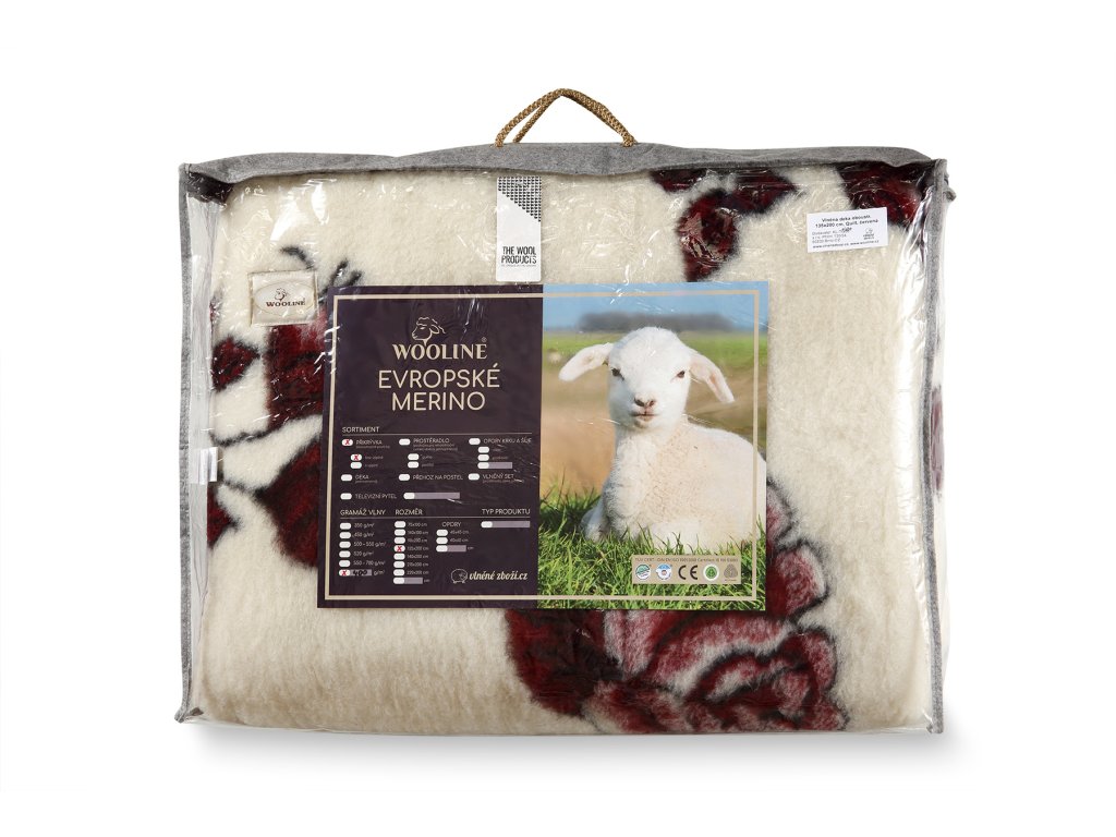 Anyag: 100% európai merinó (100% birkagyapjú), Kialakítás: kétoldalas - a fonákán motívummal, a színén világos krémszínű, Méret: 135 x 200 cm, Súly: 2,4 kg, Szálsűrűség: 2 x 400 g/m2