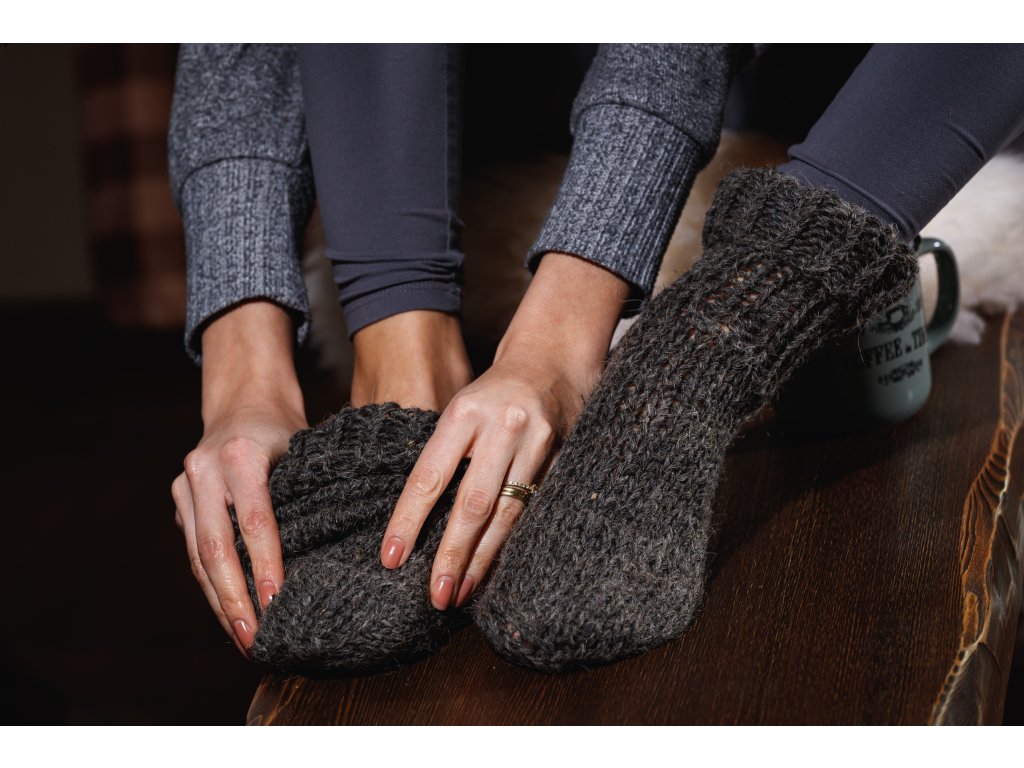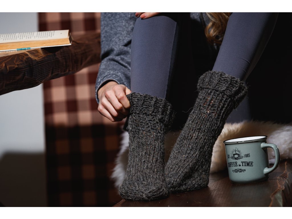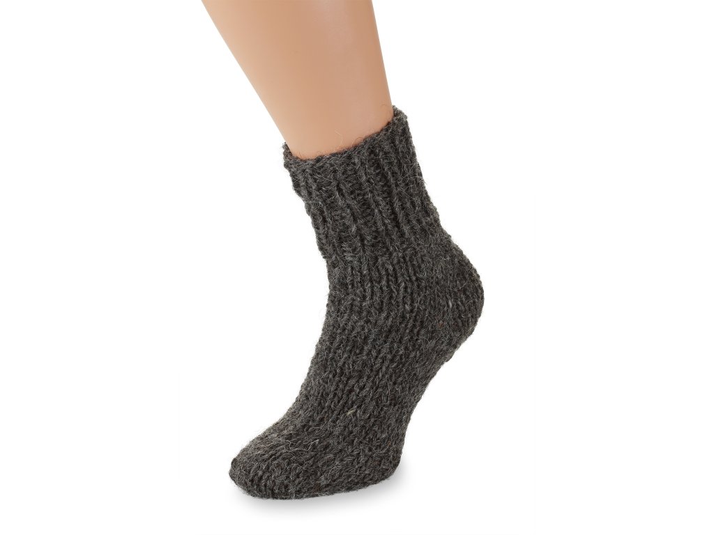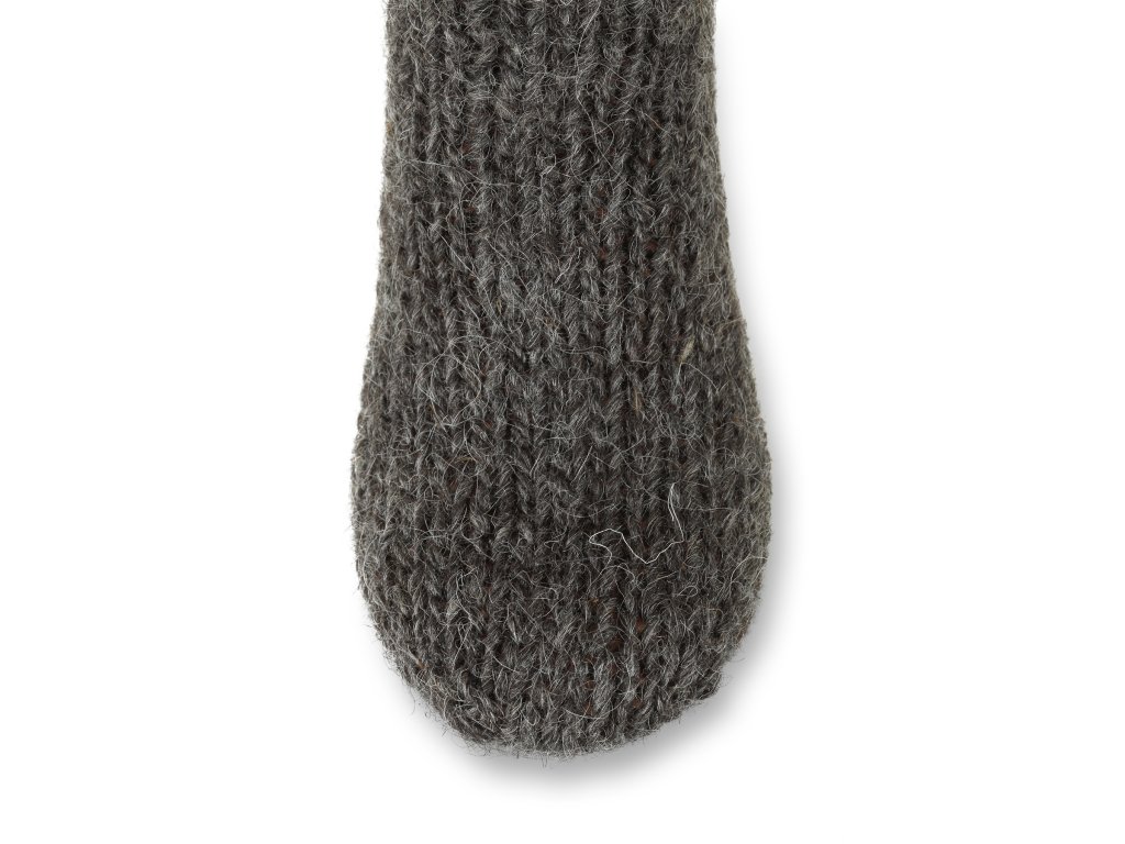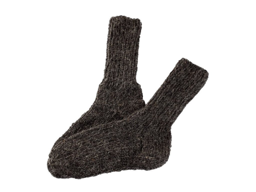 A gyapjú zokni kézzel kötött, 100% birkagyapjúból. A felhasznált anyagnak köszönhetően a zokni alkalmazkodik a lábfej méretéhez.
