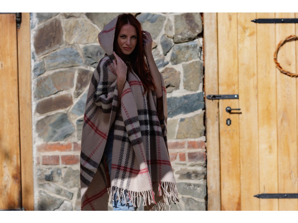 Kockás gyapjú poncsó kapucnival és rojtokkal