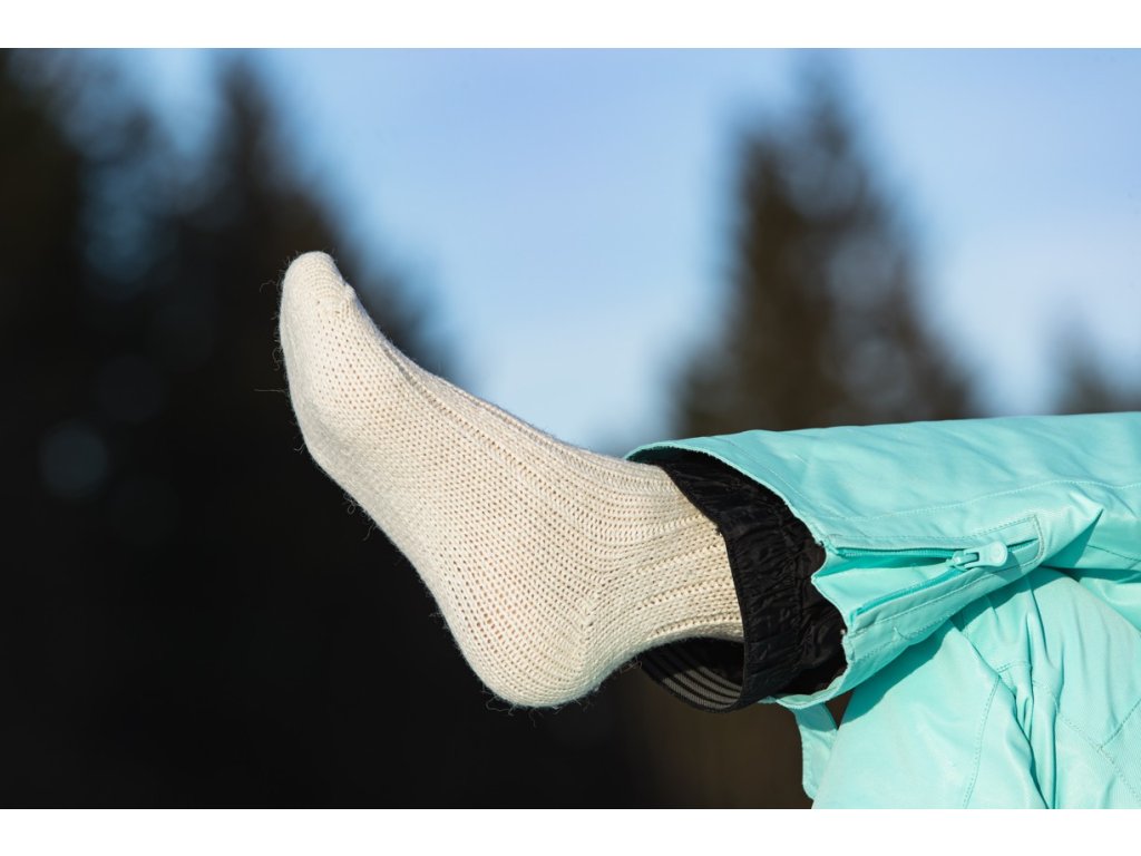 A zoknik gyártásához finom merinó gyapjút használtak, amely tulajdonságaival puha járást és stabil hőmérsékletet biztosít a lábaknak. A láb nem fog izzadni, mert a gyapjú felszívja a nedvességet, majd elvezeti.