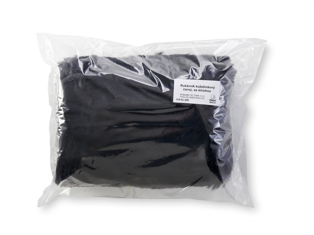 Anyag: 100% juhbőr; Szín: fekete, Méret: szélesség 30 cm, külső kerület 50 cm; Húzózsinór hossza: 40 cm - az ujj közepétől a húzózsinór közepéig mérve