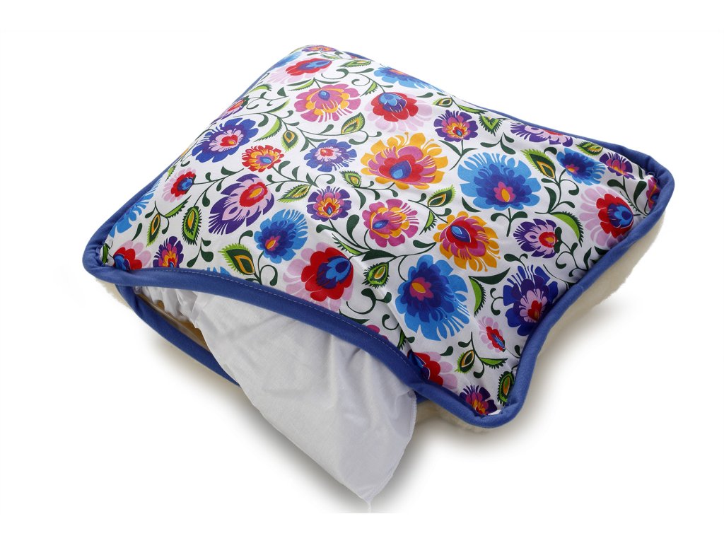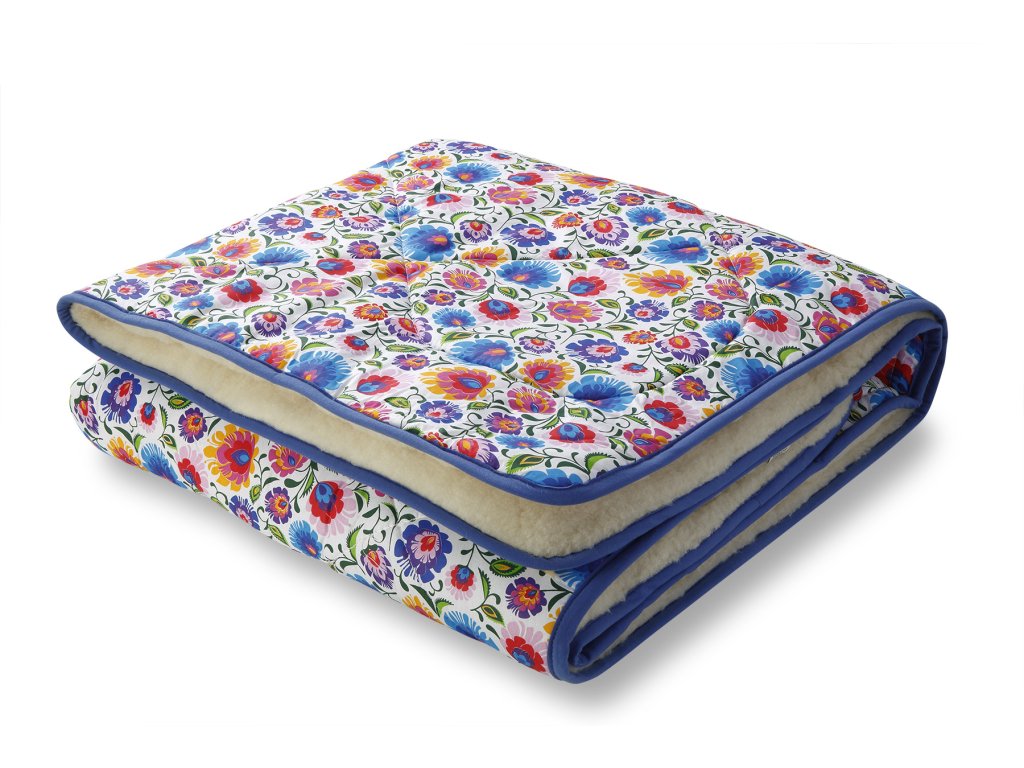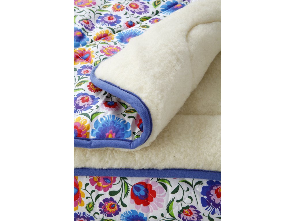 A színoldala 100% pamutból készült. Ez az anyag rendkívül puha és selymesen lágy. A színösszeállítás egy sokszínű szláv virág- és levélmotívum. Gyapjú takaró és párna a kerület körül kék szalaggal szegélyezve, ami nagyon jól megerősíti a széleket, és megakadályozza, hogy a termékek illesztései összetapadjanak.