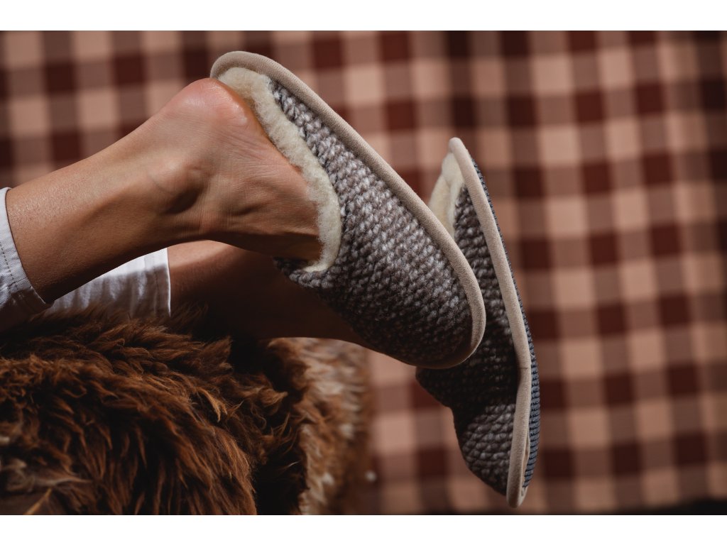 A házi papucs belső talpbetétje természetes gyapjúból, nevezetesen európai merinóból készült. A talp kellemes nem szőtt textilből készült csúszásgátló védelemmel, amelynek köszönhetően a lába még sima felületen sem fog megcsúszni. Ezenkívül a talp puha béléssel van szigetelve, ami szükség szerint megvédi a lábat a padló esetleges hidegétől. A terméket a talpán és a lábfején is elegáns szegéllyel zárták le, amely fokozza a termék esztétikai megjelenését és kiemeli a színét.