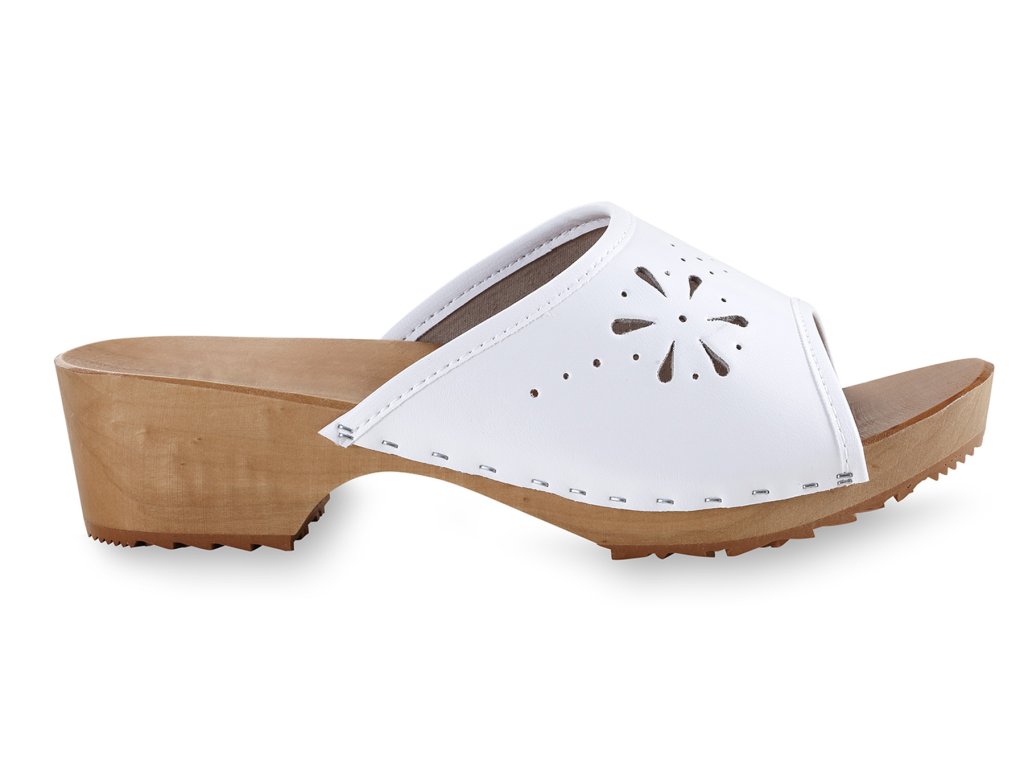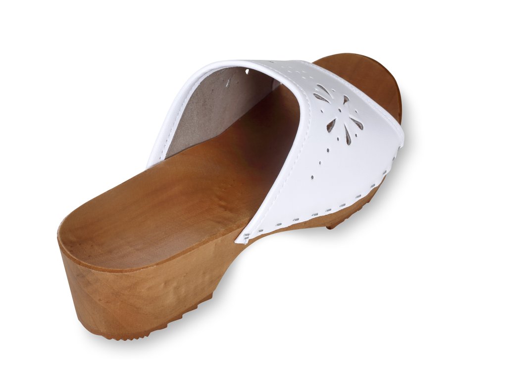Ortopéd klumpa fehér bőr felső réteggel, perforált virág mintával.