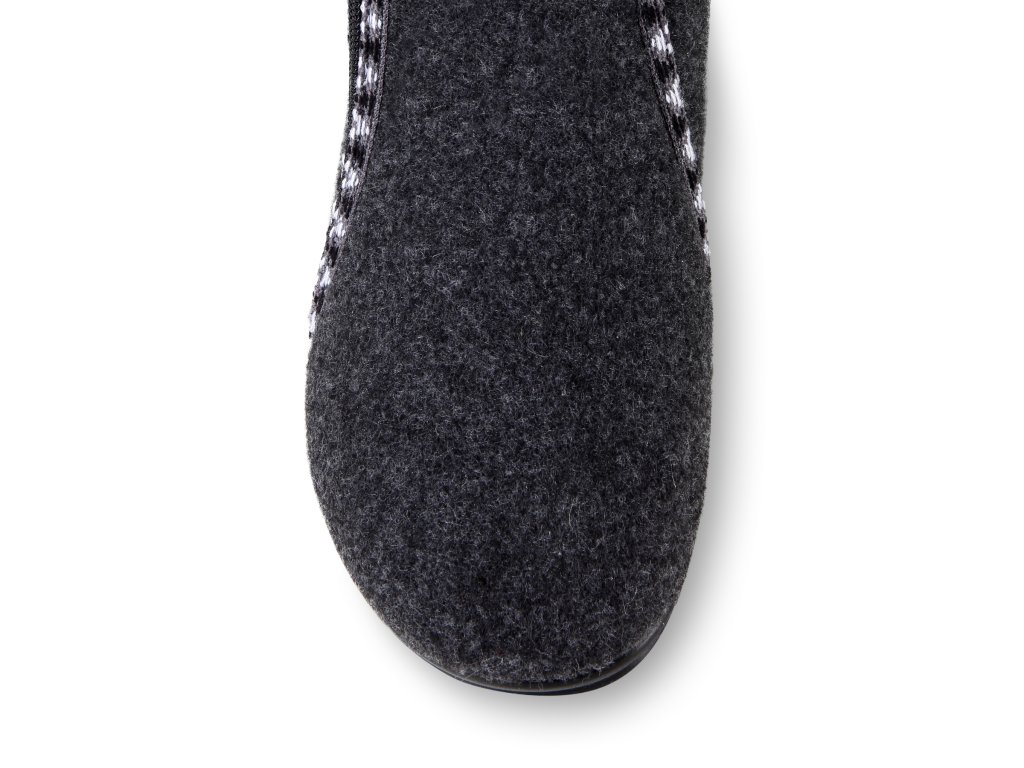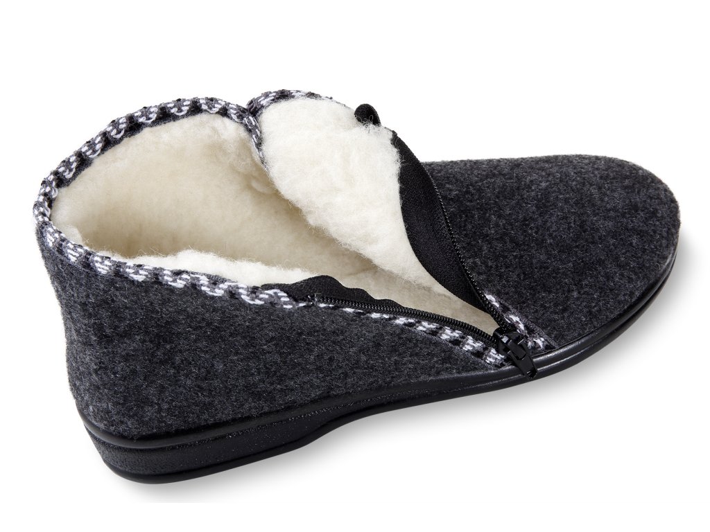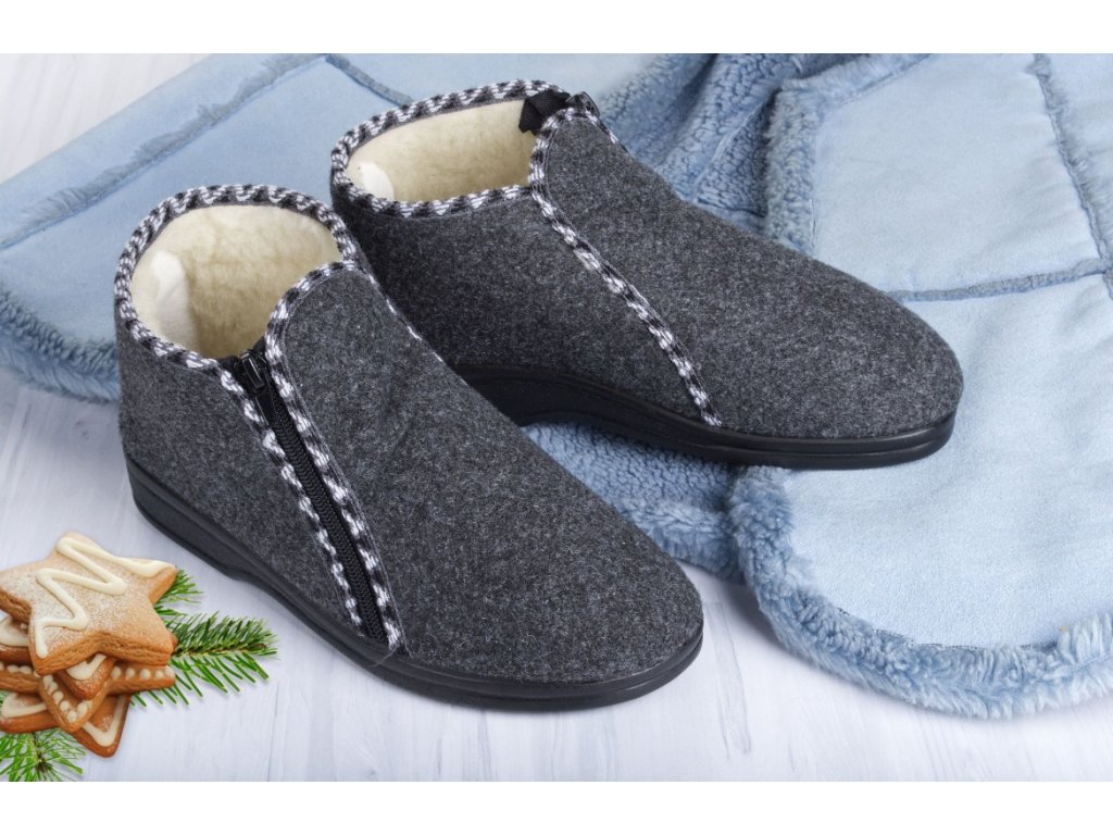 Nagyon könnyű és meleg, alacsony női mamuszok természetes sötétszürke-fekete színben. Ez a cipő teljes egészében természetes birkagyapjúval van töltve, az oldalán cipzárral záródik. Nagy előnye, hogy nagyon széles nyílással rendelkezik a lábfej számára, ami megkönnyíti a felhúzást. Párnázott minden átlagos lábmagassághoz és -szélességhez. Az alja könnyű és rugalmas PU anyagból készült.