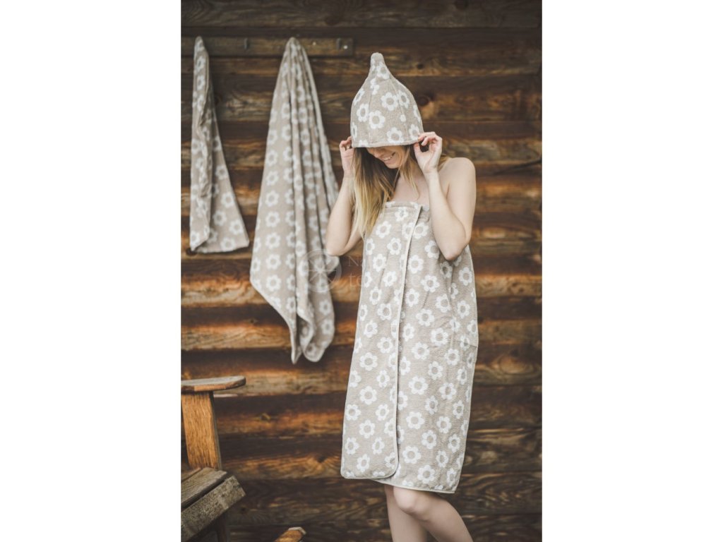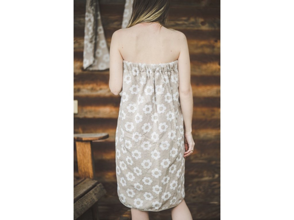 Anyag: 17% vászon, 83% pamut, Méret: 75 x 140 cm, Szín: bézs virágmotívumokkal, Felhasználás: szauna vagy zuhanyzó kiegészítője, Anyag súlya: 250g/m2, Alkalmas: nőknek