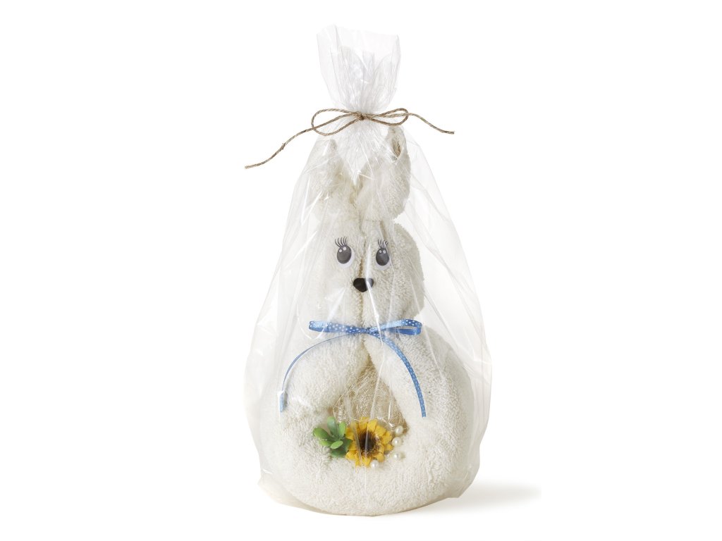 Kialakítás: ülő nyuszi nagy fülekkel, Anyag: 100% frottír törölköző, Törölköző színe: fehér, Csomag mérete: alap 16 x 10 cm, magasság 30 cm, Szálsűrűség: 500g/m2, Törölköző mérete: 50 x 100 cm, Darabszám a csomagban: 1 db