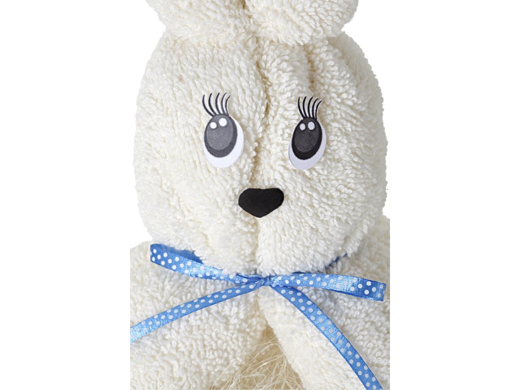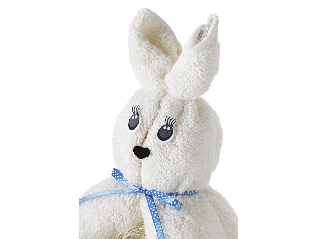 Eredeti és egyedi törülköző egy aranyos kis nyuszi alakjára hajtogatva. A nyuszi 1 darab hófehér színű 500g/m2 szálsűrűségű frottírtörülközőből készült, amelynek mérete 50 x 100 cm. A nyuszi szeme és orrocskája is papírból készült, és könnyen lehúzható. A nyakát kék színű, illeszkedő masni díszíti. Minden díszítőelemet egy tűvel rögzítenek a törölközőhöz, és könnyen eltávolítható, a törölköző pedig a szokásos módon használható.