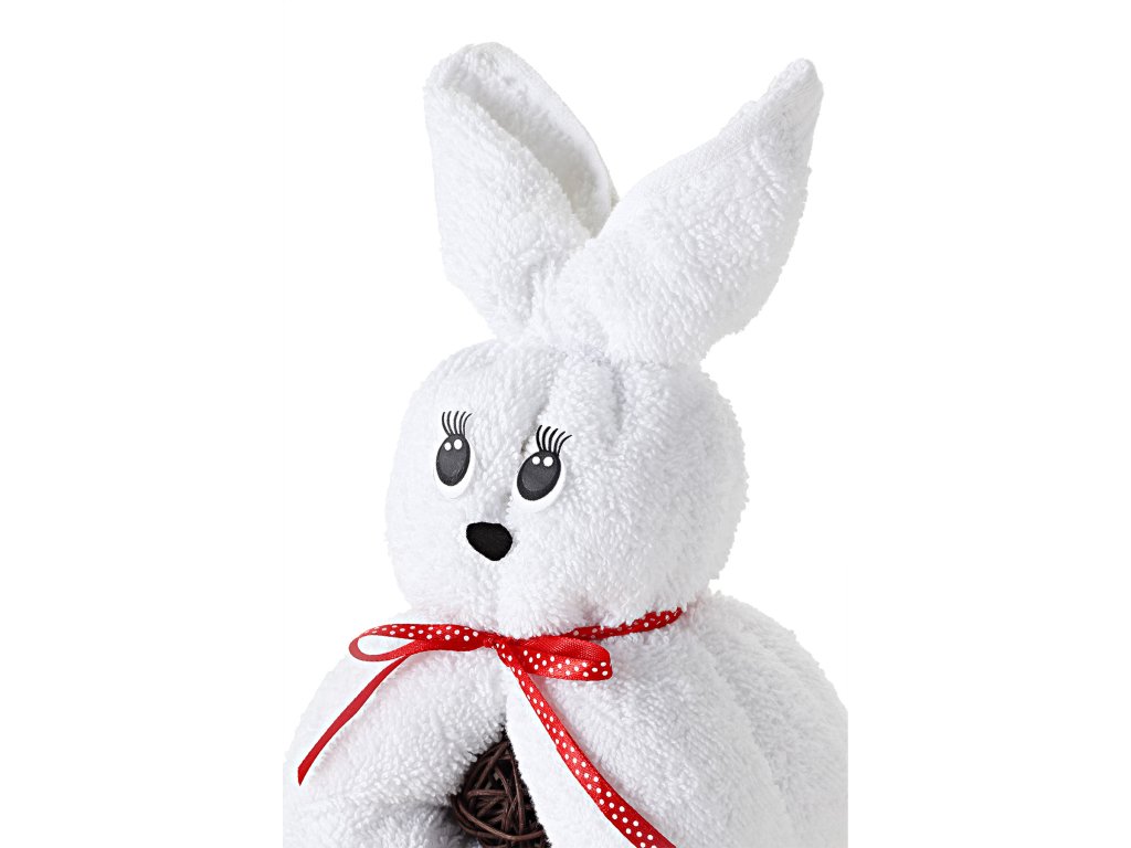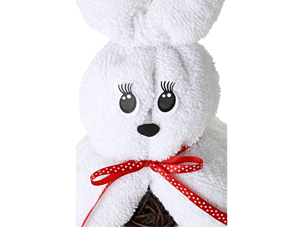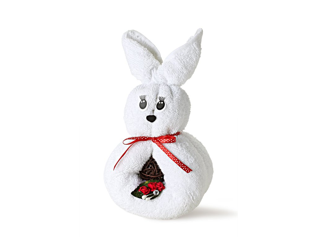 Eredeti és egyedi törülköző egy aranyos kis nyuszi alakjára hajtogatva. A nyuszi 1 darab hófehér színű 500g/m2 szálsűrűségű frottírtörülközőből készült, amelynek mérete 50 x 100 cm. A nyuszi szeme és orrocskája is papírból készült, és könnyen lehúzható. A nyakát jellegzetes piros masni díszíti. Minden díszítőelemet egy tűvel rögzítenek a törölközőhöz, és könnyen eltávolítható, a törölköző pedig a szokásos módon használható.