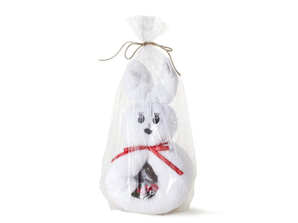 Egy aranyos kis nyuszi frottír törölközőből formázva minden korosztály számára. Nagyon népszerű a gyerekek körében, és gyakran előfordul, hogy végül a törölközőt ki sem csomagolják és nem használják.