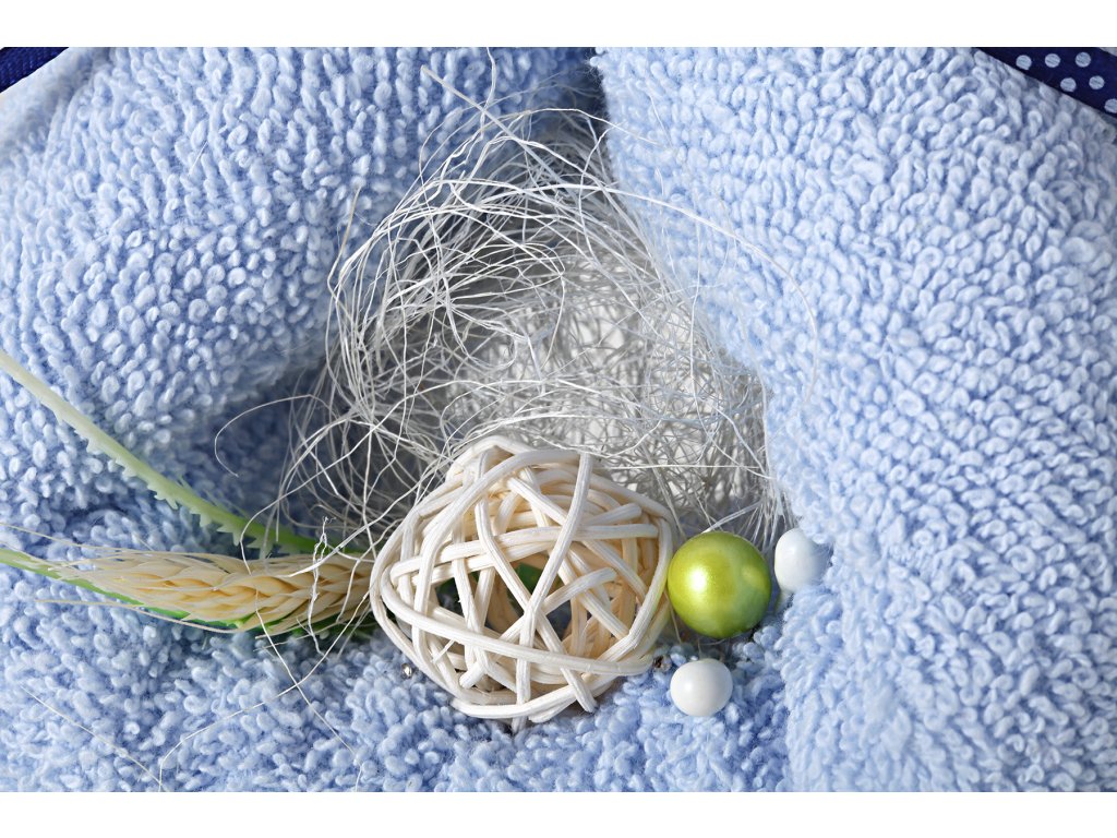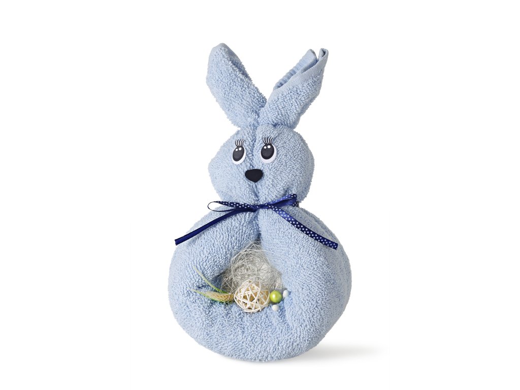 Eredeti és egyedi törülköző egy aranyos kis nyuszi alakjára hajtogatva. A nyuszi a következőkből áll 1 darab égszínkék színű,500g/m2súlyú frottír törölközőből a mérete 50 x 100 cm. A nyuszi szeme és orrocskája is papírból készült, és könnyen lehúzható. A nyakát sötétkék színű, jellegzetes pöttyös masni díszíti. Minden díszítőelemet egy tűvel rögzítenek a törölközőhöz, és könnyen eltávolítható, a törölköző pedig a szokásos módon használható.