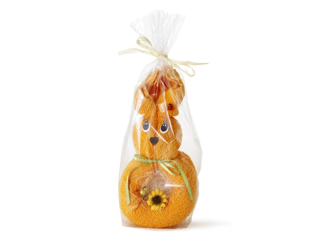 Eredeti és egyedi törülköző egy aranyos kis nyuszi alakjára hajtogatva. A nyuszi a következőkből áll 1 darab narancssárga színű,500g/m2súlyú frottírtörülközőből a mérete 50 x 100 cm. A nyuszi szeme és orrocskája is papírból készült, és könnyen lehúzható. A nyakát egy jellegzetes zöld pöttyös masni díszíti. Minden díszítőelemet egy tűvel rögzítenek a törölközőhöz, és könnyen eltávolítható, a törölköző pedig a szokásos módon használható.