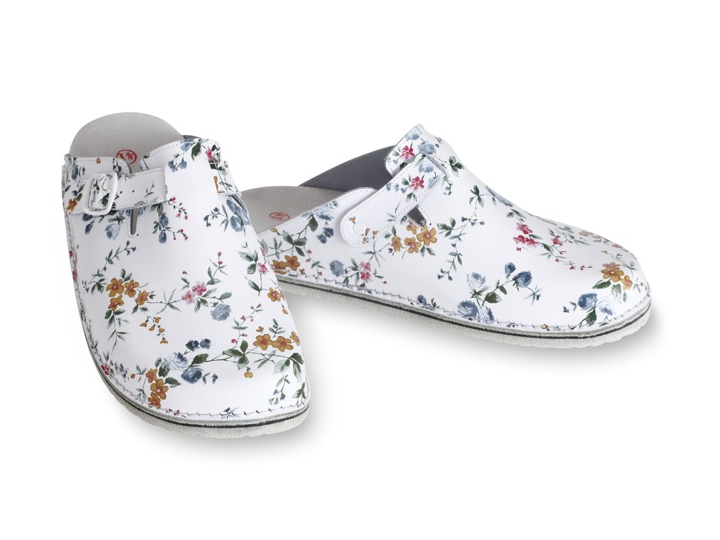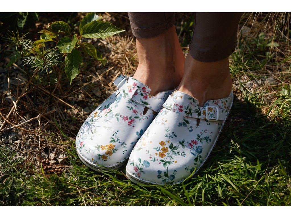 Ortopéd papucs modern és finom virágmintával, zárt orral.