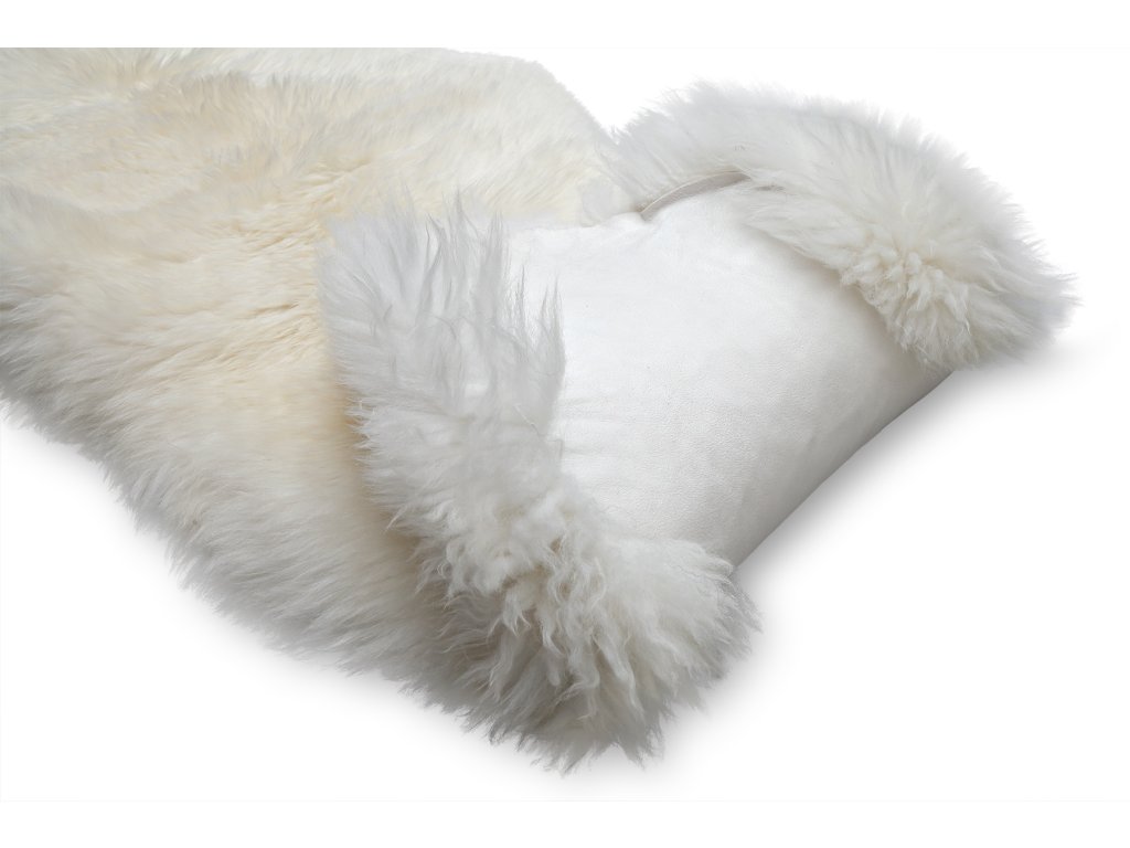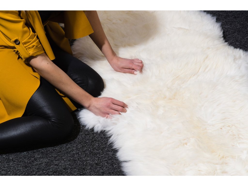 Az ovális alakú birkabőrök párna természetes eredetű, a bolyhos és a felület krémfehér. A szőnyeg két közepes hosszúságú birkabőr összevarrásával készült, és ovális formára van alakítva.