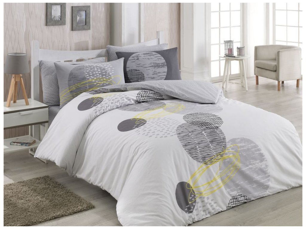 A paplan- és párnahuzatból álló ágynemű szett 100% pamutból készült. Az ágyneműt körökből álló motívummal nyomtatják, amelyek a szürke különböző árnyalataiban jelennek meg. A szürke motívumot sárga motívumok szövik át, ami kellemesen frissé teszi a teljes dizájnt. A praktikus gombos rögzítés biztosítja az ágynemű kényelmes cseréjét.