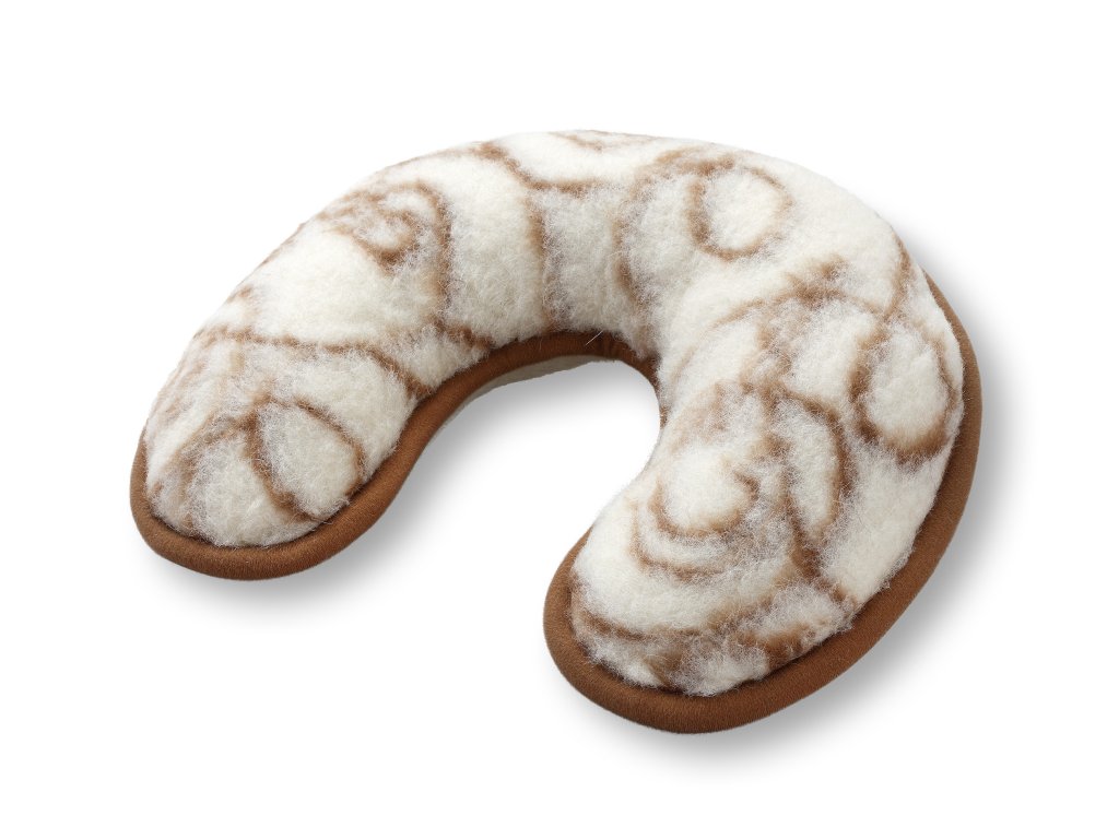 A patkó alakú gyapjú párna időtlen dizájnban, kétoldalú kivitelben készül. A hátoldal egyszínű, az előoldalon aranyszínű szemekből álló motívum látható. A külső felülete 100% birkagyapjúból készült. A párnák felülete puha és kellemes tapintású. Az egyes patkó alakú fejpárnák motívuma részben eltérhet az illusztrációs fotótól.