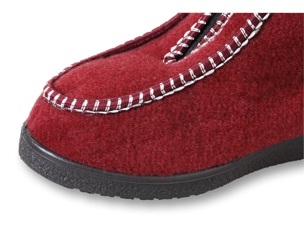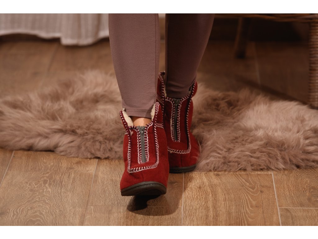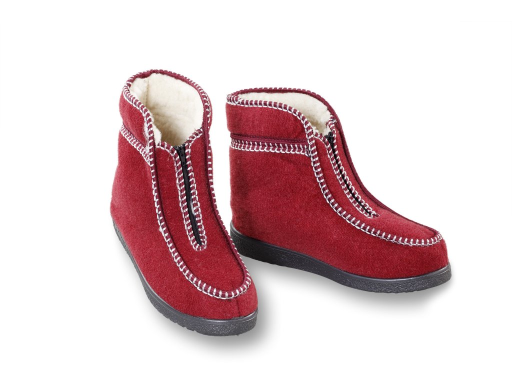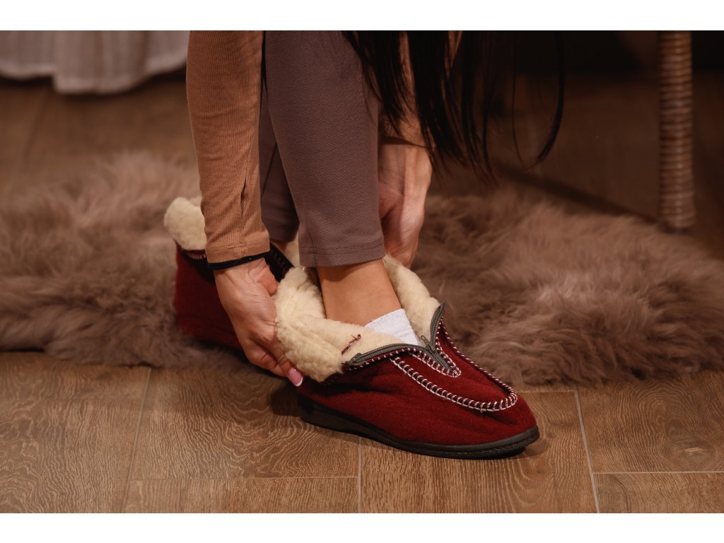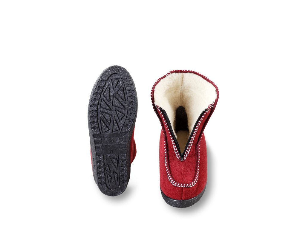 Anyag: külső réteg nemez / belső réteg 100% birkagyapjú / talp csúszásmentes műanyag, Kapható méretek: 37-42, Szín: külső felület mélyvörös színű, belső réteg világos krém, Talp: nem könnyített, gumi, kemény csúszásmentes