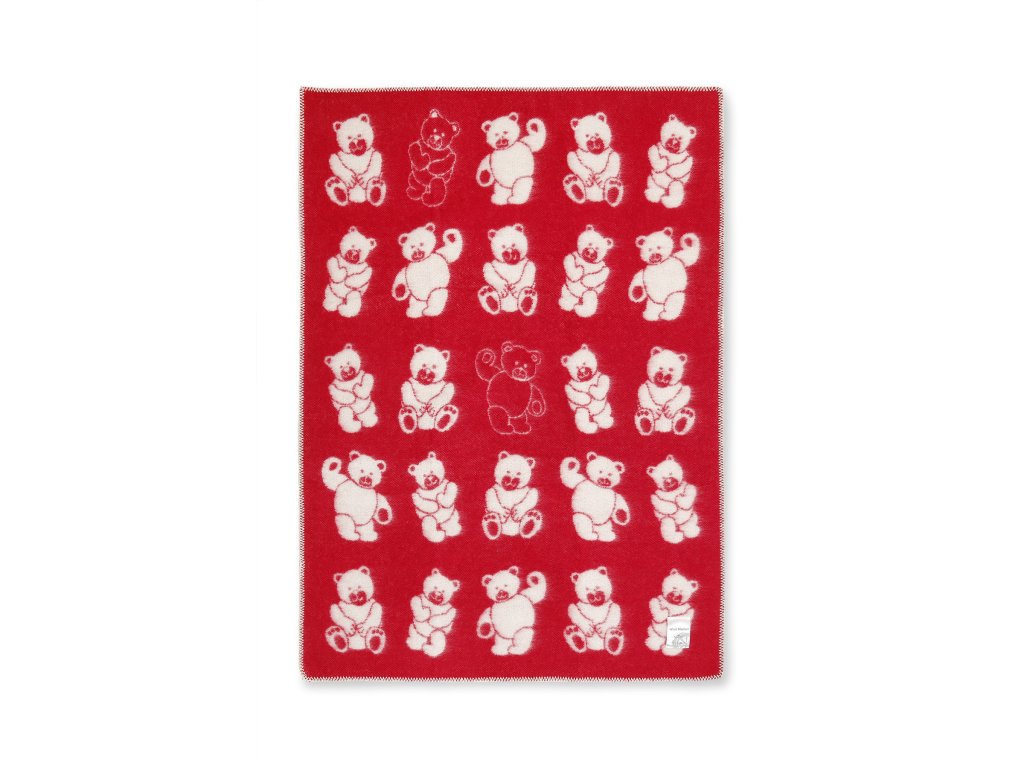 Anyag: 88% új-zélandi juhgyapjú + 12% pamut, Méret: 90 x 130 cm, Szín: piros, Megjelenített motívum: mackó, Súly: 0,57 kg, Súly: 480g/m2
