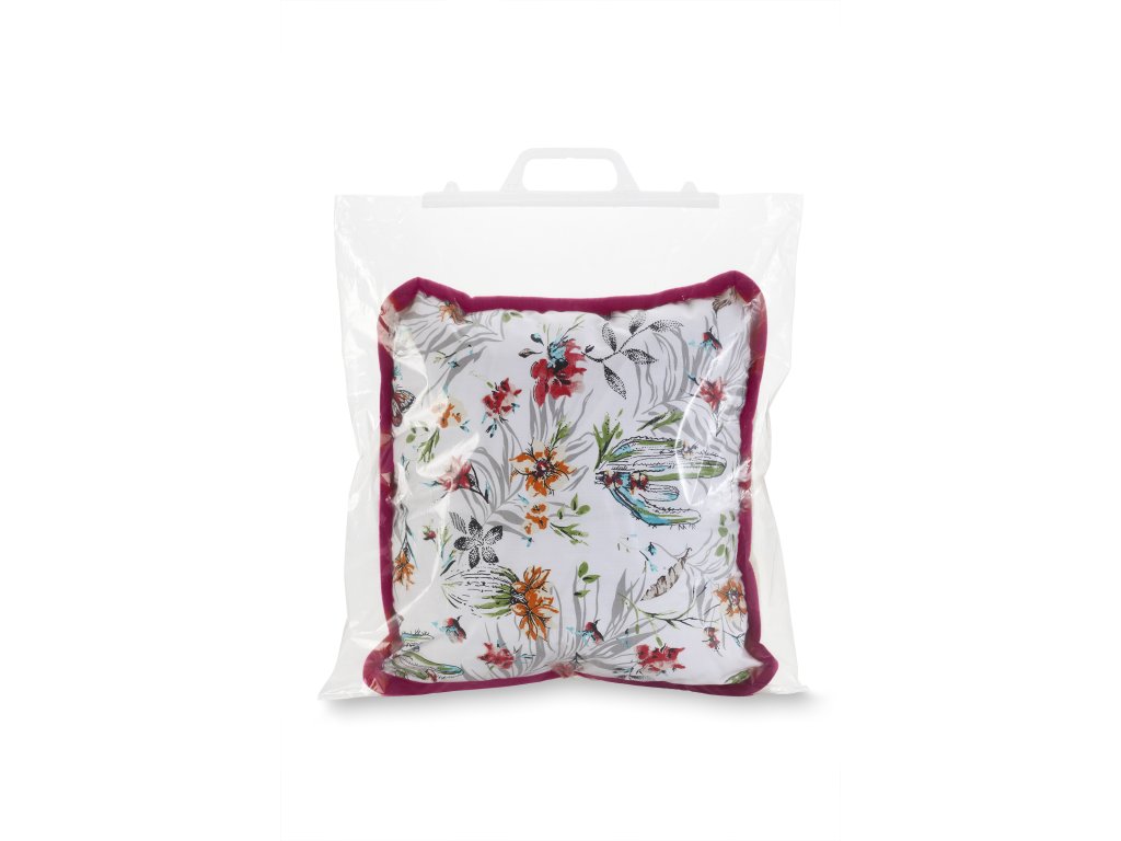 Anyag: felület 100% pamut / 100% európai merinói gyapjú, Töltelék: 100% szilikon golyók, Méret: 40 x 45 cm, Design: kétoldalas- a hátoldalon eredeti virág- és kaktuszmotívummal, a hátoldalon egyszínű, világos krémszínű, Gyapjú súlya: 400g/m2