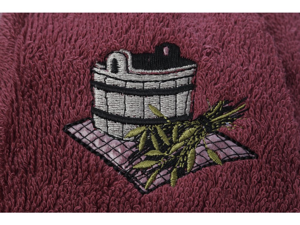 A szauna sapka anyaga 100% frottír pamut, amely nagyon puha és kellemes tapintású. A szaunasapkákat szaunában való használatra tervezték a fej túlmelegedése ellen. És ez a fő funkciójuk. A felhasznált anyag erősebbé, ellenállóbbá és tartósabbá teszi a sapkát. A szaunasapka mélyvörös színű, az elején hímzett vödör szimbólummal.