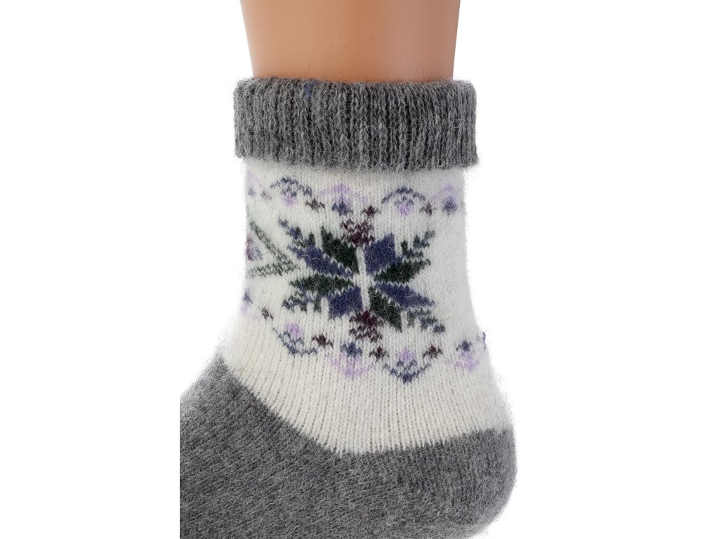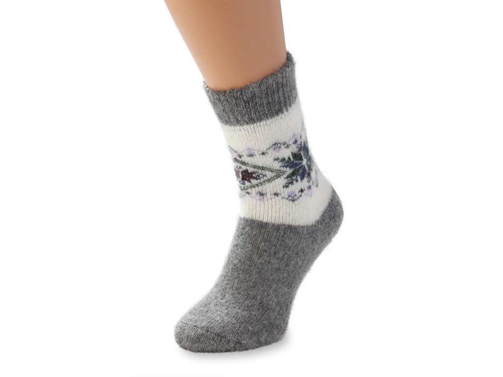 A gyapjú zoknik szürke színűek, amely fehérbe megy át. A zokni fehér felületét sokszínű hópehely minta díszíti.