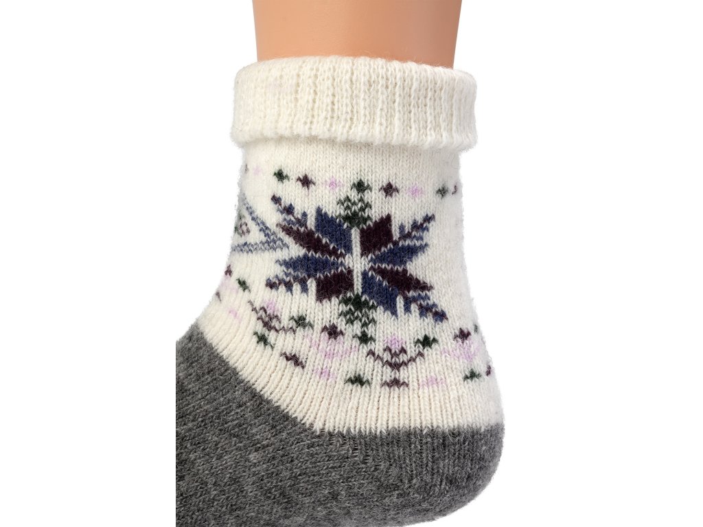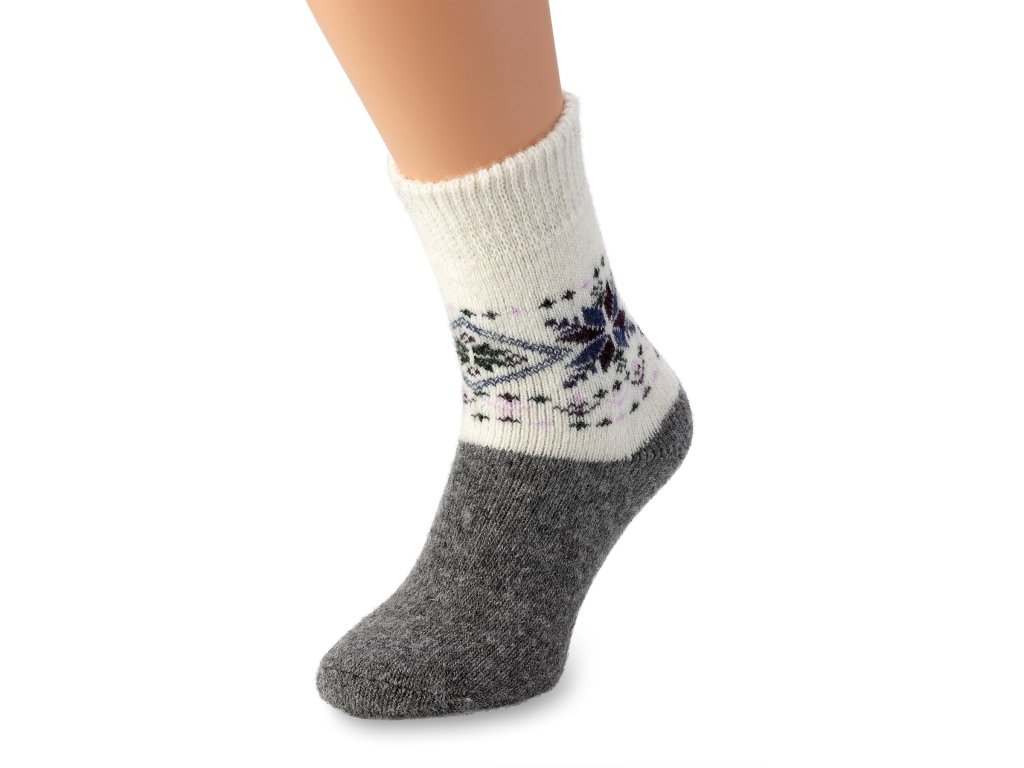 A gyapjú zoknik szürke színűek, amely fehérbe megy át. A zoknik fehér felületén lilás-kék színű hópehely minta található zöld motívumokkal.