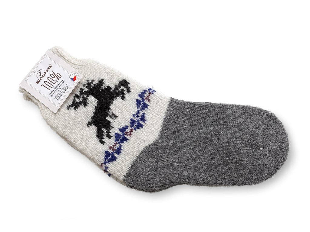 A gyapjú zoknik szürke színűek, amely fehérbe megy át. A zokni fehér részén egy ugrásban lévő rénszarvas mintája látható. A rénszarvas egy lila színű kontúrvonallal van kiemelve.