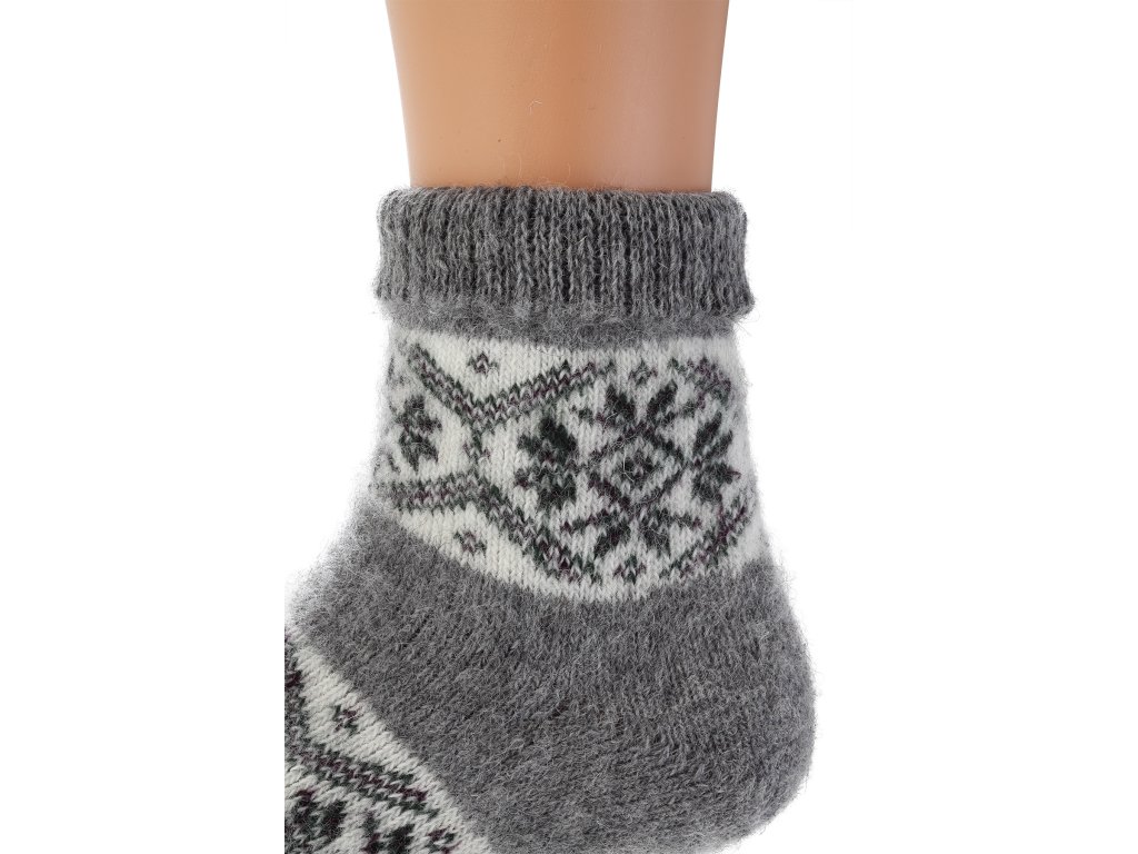 A mintás gyapjú zoknik 100% birkagyapjúból készültek gépi kötéssel, amely lágyított és nagyon finom tapintású. A felhasznált anyagnak köszönhetően a zokni alkalmazkodik a lábfej méretéhez.