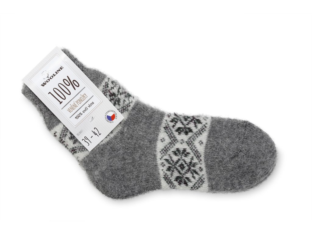 A gyapjú zoknik alapszíne szürke, amely fehér csíkokkal kombinált. A zoknik fehér felületén zöld színű hópehely motívum található.