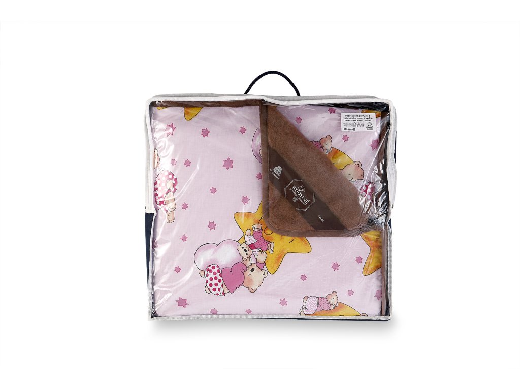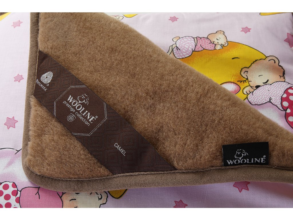 Anyag: 95% ausztrál merinó + 5% teve gyapjú / 100% pamut, nyomtatással, Kialakítás: megfordítható- a hátoldalon rózsaszín alapon. A pléd vidám alvó csillagok, egy hold és egy aranyos mackó van nyomtatva. A fonáka sötétbarna színű; Méret: 100 x 135 cm, Súly: 1,0 kg, Szálsűrűség: 500 - 550g/m2