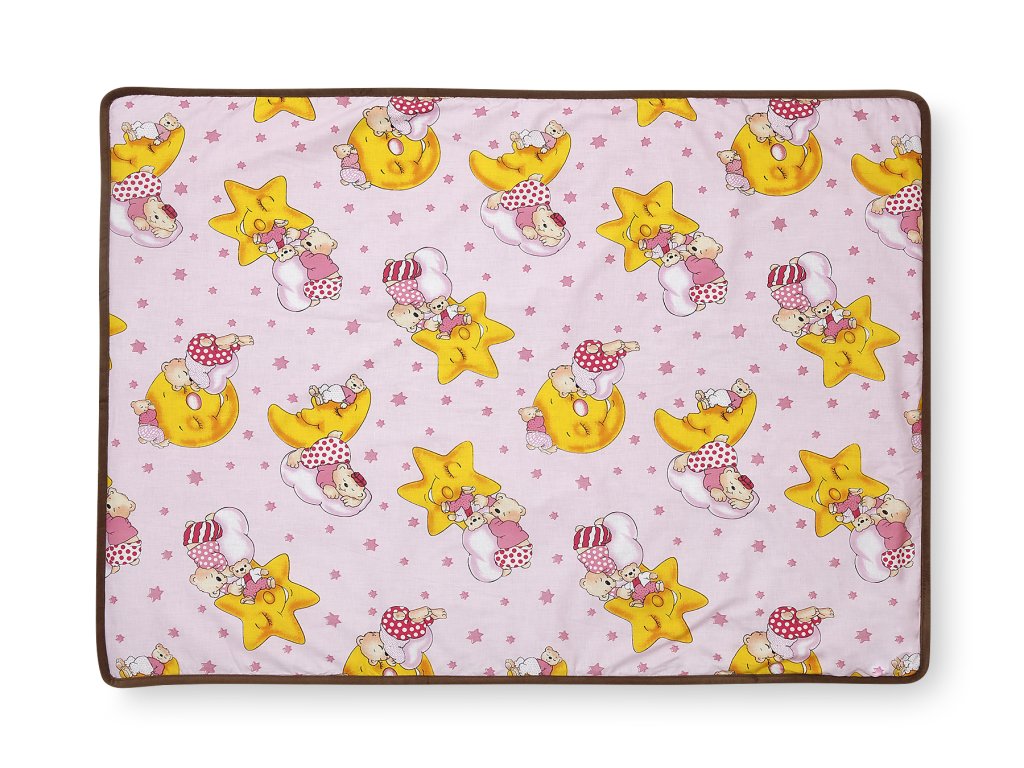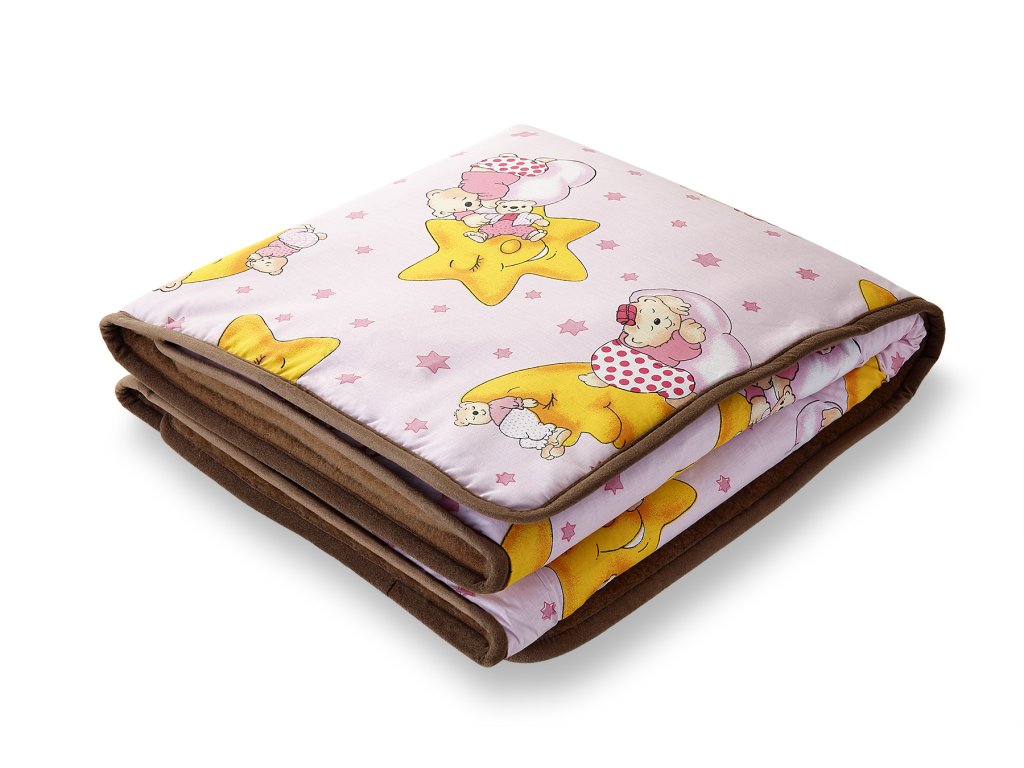 Ez az egyedi, megfordítható, alvócsillag motívummal ellátott babatakaró két különböző anyag kombinációjából készült, amelyek használat közben tökéletesen kiegészítik egymást. A plédek hátoldala 100% pamutból készült, amelynek rózsaszín alapszíne van. A takaró rózsaszín hátoldalán mosolygó alvó csillagok, körömvirágok és egy alvó mackó motívuma látható.
