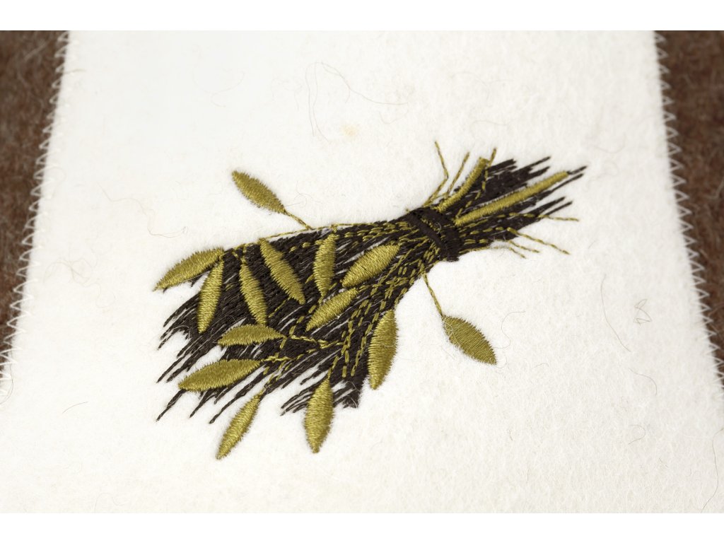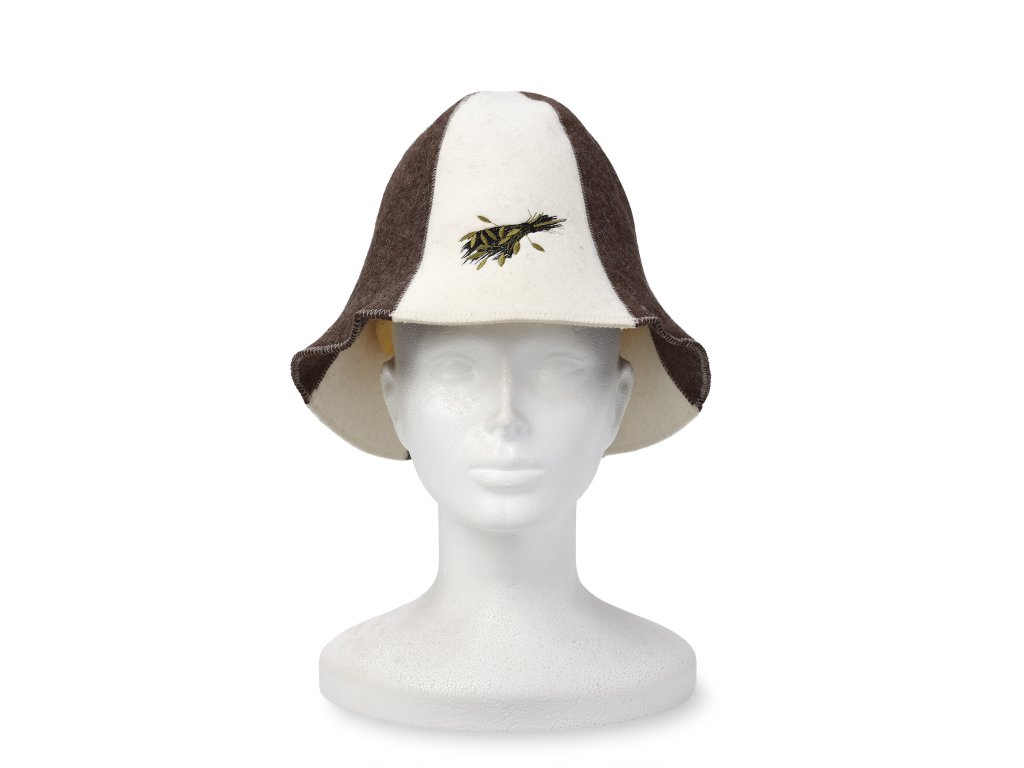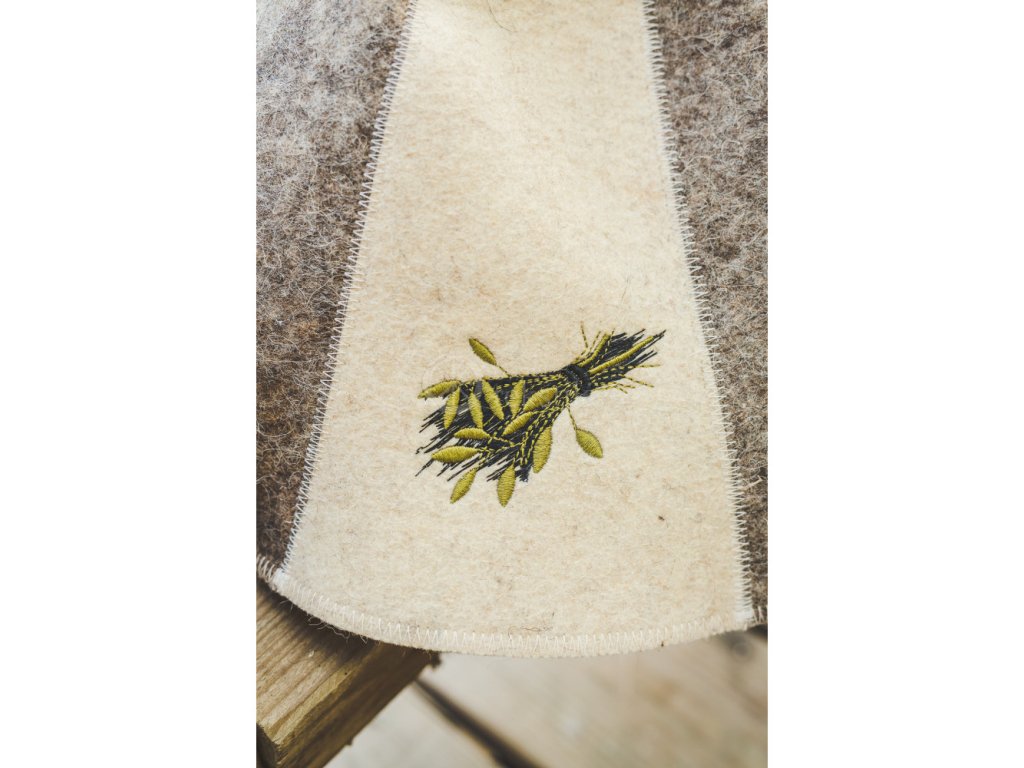 A szauna sapka 100% gyapjúból készült. A szauna sapka világos krémszínű és sötétbarna színű. A sapkán világos és sötét elemek váltakoznak, ami nagyon érdekes, eredeti divatos, ugyanakkor funkciós kiegészítő. A szaunasapka eleje a behajtott füleket szimbolizáló hímzéssel van ellátva. A gyapjú sapkákat szaunában való használatra tervezték. A felhasznált anyag erősebbé, ellenállóbbá és tartósabbá teszi a sapkát. A modern technológia lehetővé teszi a porózus, „szellőző” szintetikus vagy félszintetikus anyagok gyártását.