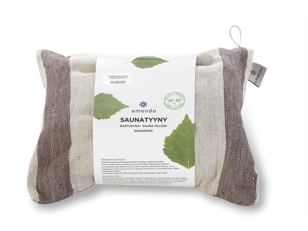 A szaunapárna a fej, a nyak és a hát kényelmét szolgálja a szaunában töltött idő alatt. A len párna mérete 28 x 26 cm. A párnák világosbarna színű, sötétbarna csíkokkal.