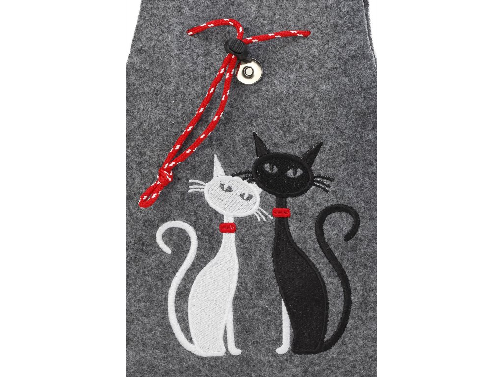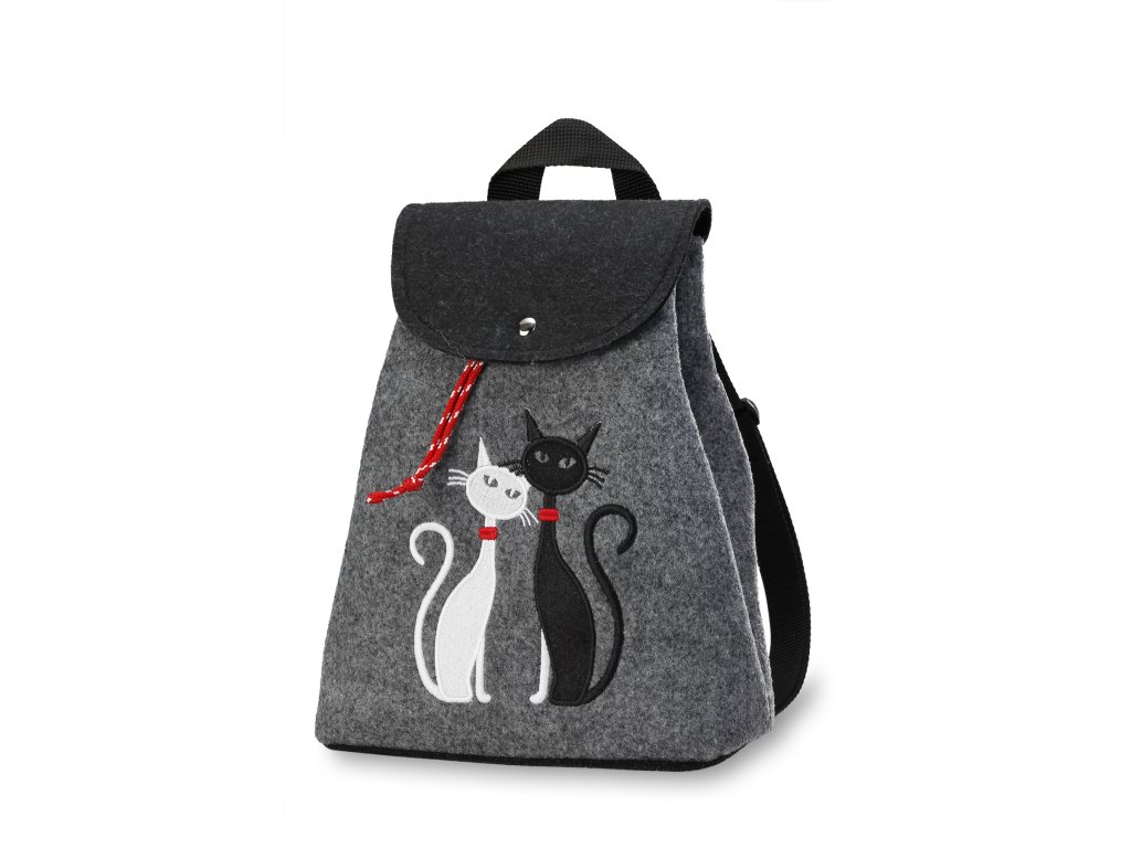 A stílusos és egyedi hátizsák 100% nemezből készült. A nemezből készült hátizsák teste világosszürke színű. A külső oldalon két macskát ábrázoló hímzés található. Mindegyik macska piros nyakláncot visel. A hátizsákot pantentzárral lehet becsatolni. A hátizsák belső része összehúzható a hátizsák tetején lévő, bevarrt húzózsinórral. A hátizsák két pánttal van felszerelve, amelyek opcionálisan állíthatóak. A pántok alul fekétek, kívülről egy piros-fekete csíkkal díszített díszítéssel. A hátizsákot a tetejére varrt fogantyúval lehet megfogni.