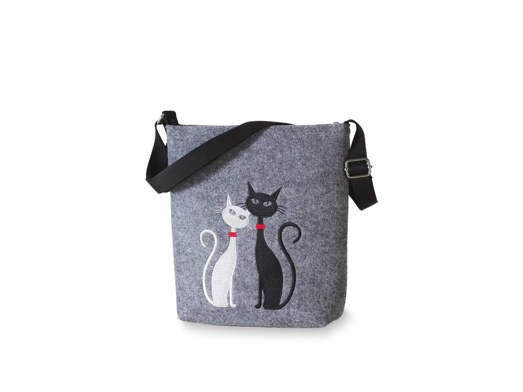 Szín: A táska teste világosszürke filcből készült. Az elülső oldalon két fekete-fehér kombinációjú macska van hímezve. A hímzés mérete 14 cm széles x 15 cm magas. A szíj fekete színű, a szíjon lévő csatok fémből készültek.