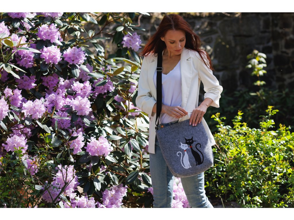 A táska világosszürke filcből készült. A táska elülső részén két macskát ábrázoló fekete-fehér hímzés található. A hímzést úgy alakítják, hogy illeszkedjen a táska színárnyalatához, és egységes harmóniát alkosson. A filc kézitáska az egyszerűség és a funkcionalitás kombinációja. A hosszanti téglalap alakú forma nagyon kényelmes viseletet és használatot tesz lehetővé.
