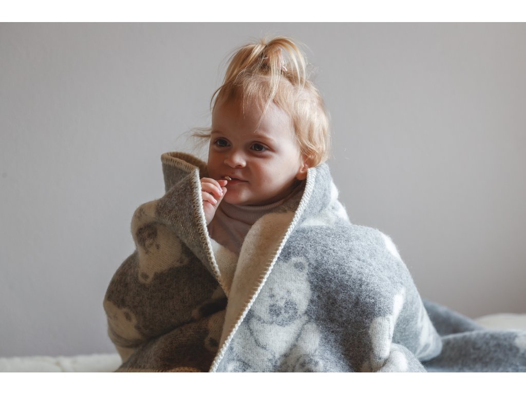Az új-zélandi juhgyapjúból készült puha és meleg pléd szürke színben 90 x 130 cm-es méretben kerül forgalomba. A pléd a takaró mackó motívummal van nyomtatva, és kisgyermekek számára készült. A gyapjú plédek használatakor úgynevezett "száraz hő" keletkezik, ami nagyon kellemes és jótékony hatással van az egészségre.