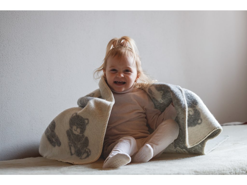 Anyag: 88% új-zélandi juhgyapjú + 12% pamut, Méret: 90 x 130 cm, Szín: szürke, Megjelenített motívum: mackó, Súly: 0,57 kg, Súly: 480g/m2
